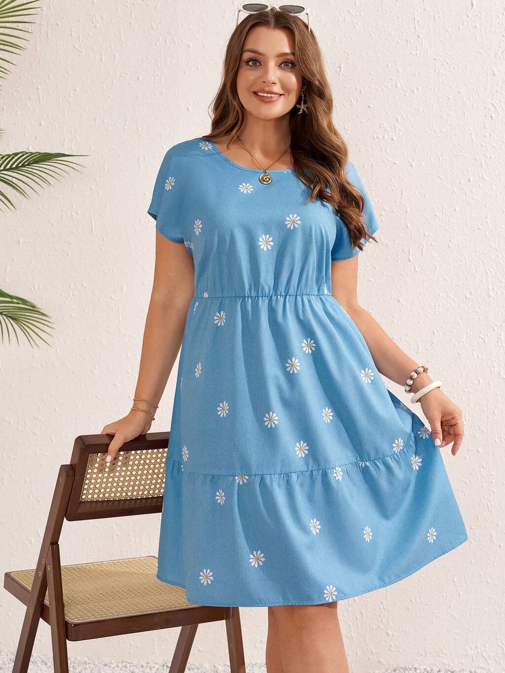Plus Size Women's Daisy Print Round Neck Short Sleeve Ruffle Hem Dress, Summer Outfit For Women,Spring Outfit Women,Casual Dresses For Women,Vacation Outfits Women, Beach Outfits For Women,Summer Holiday Outfits,Summer Holiday Outfits,Blue Dresses For Women Spring Dresses For Women Zanzea Dress For Women Plus Size Picnic Dresses For Women Zanea Dress For Woman