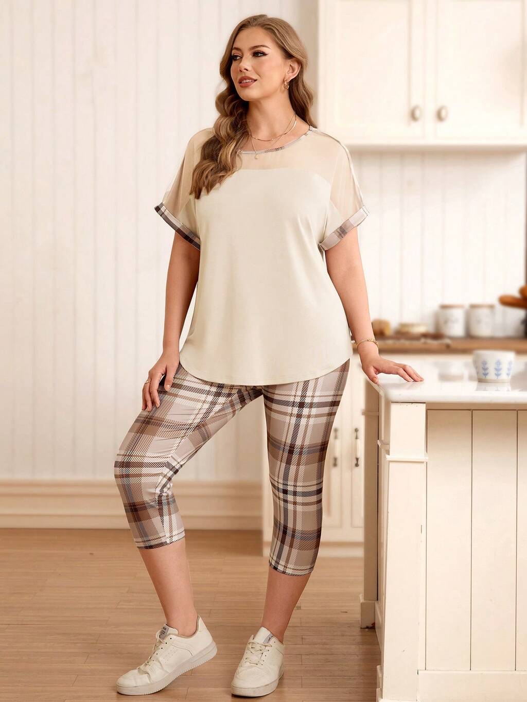 Plus Size Patchwork T-Shirt And Plaid Leggings 2 Pieces Set,2pc Set Plus Size Women's Summer Casual Vacation Round Neck Short Sleeve Mesh Patchwork T-Shirt And Plaid Leggings 2 Pieces Set,Summer Holiday,Spring Break Outfits ,Vacation Outfits Women ,Holiday Outfits For Women,Going Out Outfits,2026 New Clothes,Simple And Fashionable For Everyday Wear, Capri Pants Set, Plaid Capri Set,Suitable For Summer, Vacation, Commute, Daily Wear,Casual Home Set, Summer Outfits,Gifts For Mother