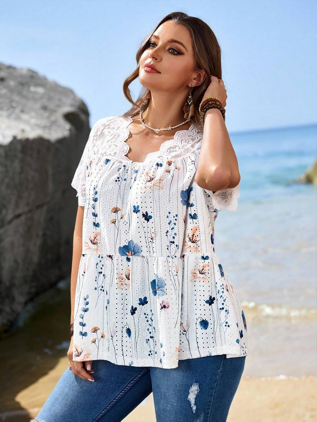 Plus Size Floral Lace Patchwork T-Shirt, Suitable For Spring/Summer Vacation, Summer Tops