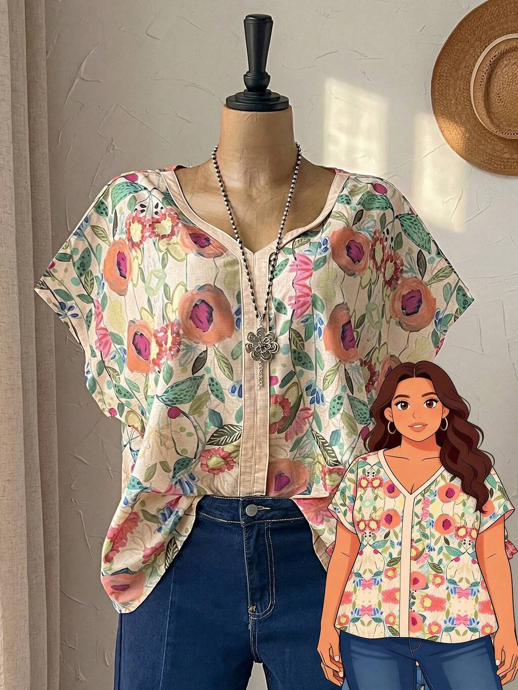 Plus Size Women Floral V-Neck Batwing Short Sleeve Casual Blouse Summer Spring Country Style For Women, Going Out Tops