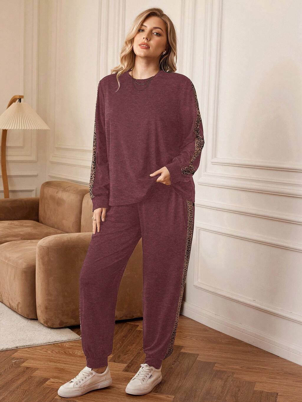 Plus Size Casual Leopard Print Patchwork Top And Pants 2 Pieces Set, Autumn Women's Lounge Sets Loungewear Women Comfy Sets Women Spring Break Outfits Spring To Summer