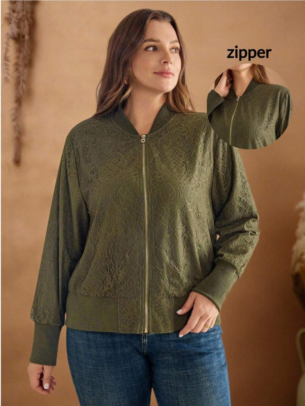 Plus Size Women's Green Casual Commuter Lace Front Center Zip Up Bomber Jacket, Fall Autumn Winter