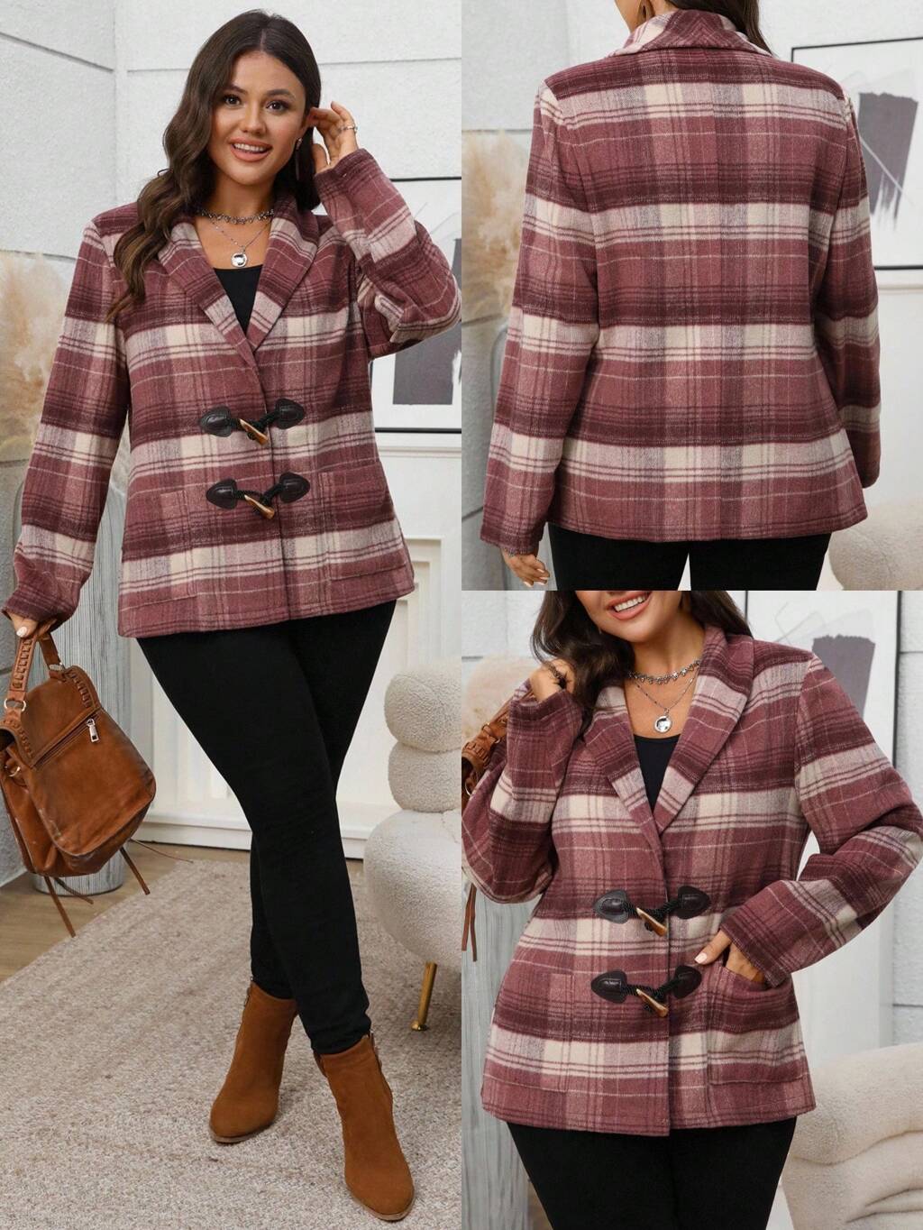 Plus Size Women Plaid Shawl Collar Long Sleeve Horn Button Front Casual Pockets Jacket,Business Casual Woman,Winter Clothes For Women,Chic Autumn&Winter Fall