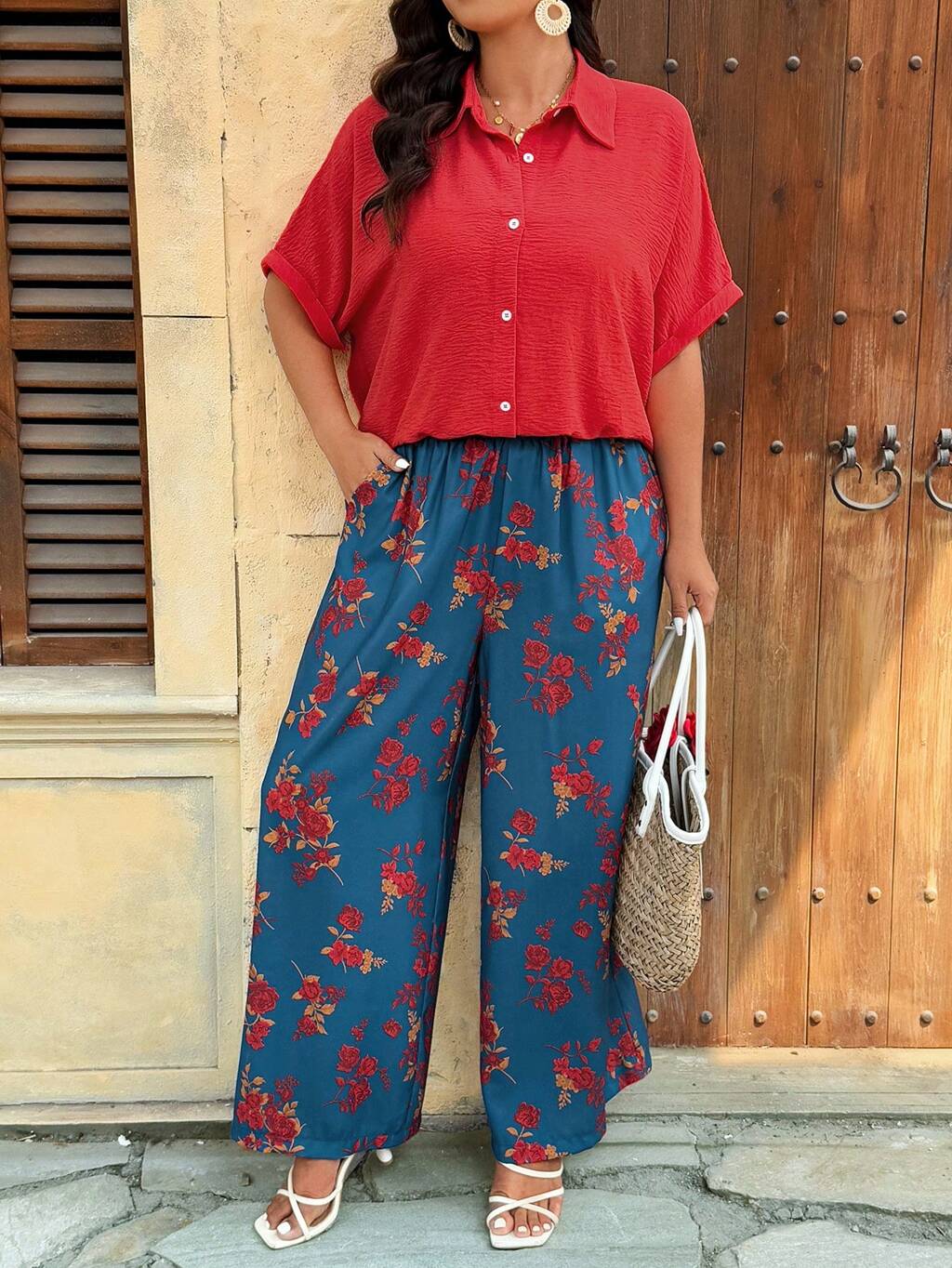 2pcs Women Casual Plant Print Shirt And Pants Set, Spring/Summer,Casual