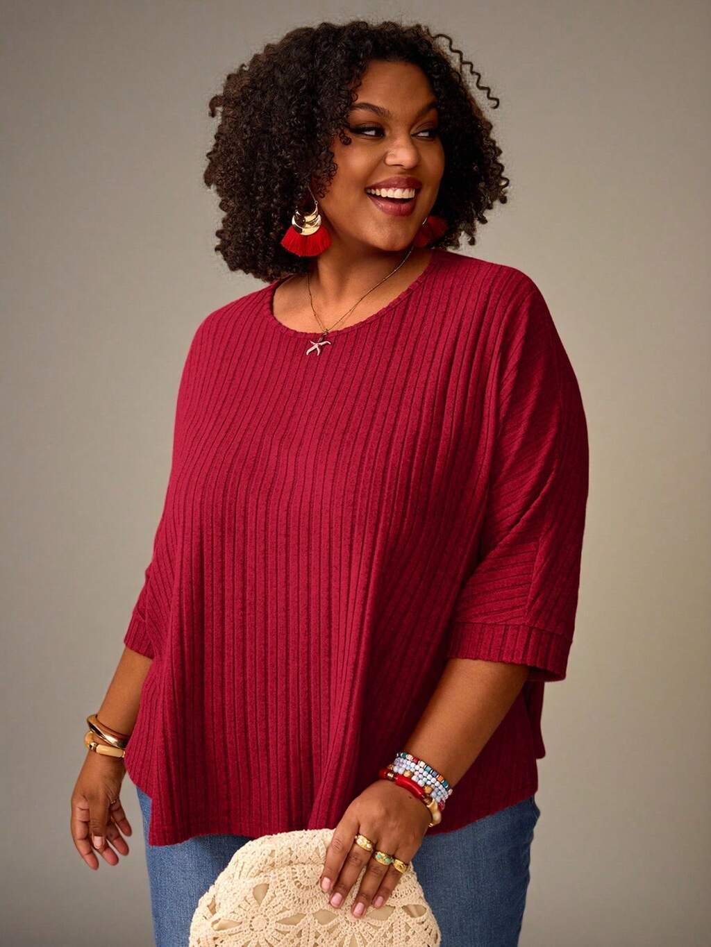 Camiseta blanca de manga 3/4 holgada y casual de verano para mujer de talla grande, ideal para vacaciones, primavera, salidas, 2026 nueva, simple y de moda para uso diario. Camiseta de punto acanalado de unicolor de talla grande. Blusas rojas de talla grande