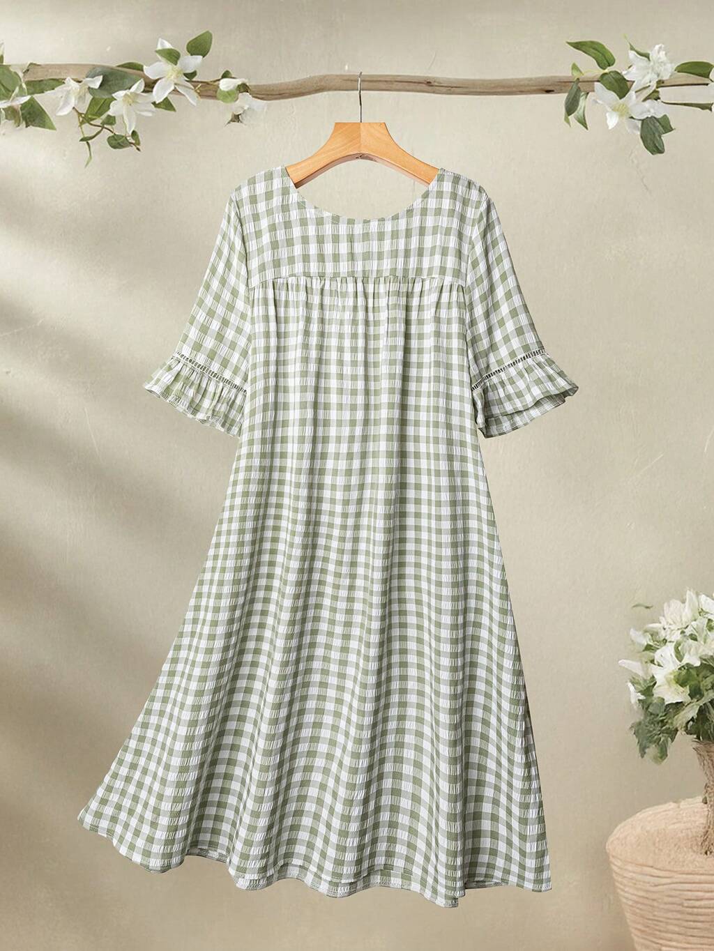 プラスサイズのカジュアルチェック柄半袖ワンピース、シンプルでファッショナブルなスタイル、夏、カジュアルな休日スタイル、カジュアルな休日の衣装、夏のファッション、女性の夏のアウトフィット、母の日の服装、カントリーコンサートの衣装、女性のボヘミアンスタイルの衣装、女性のウェスタンスタイルの衣装、女性の休日の衣装、女性の夏の服、プラスサイズの女性の服、ビジネスカジュアルな女性の夏の服