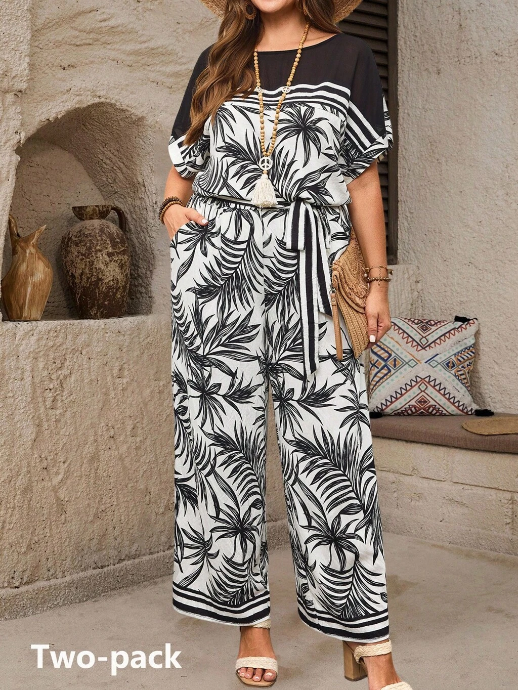2枚組 プラスサイズ ウーマン フローラルプリント 半袖トップス & ショーツ バケーションアウトフィット