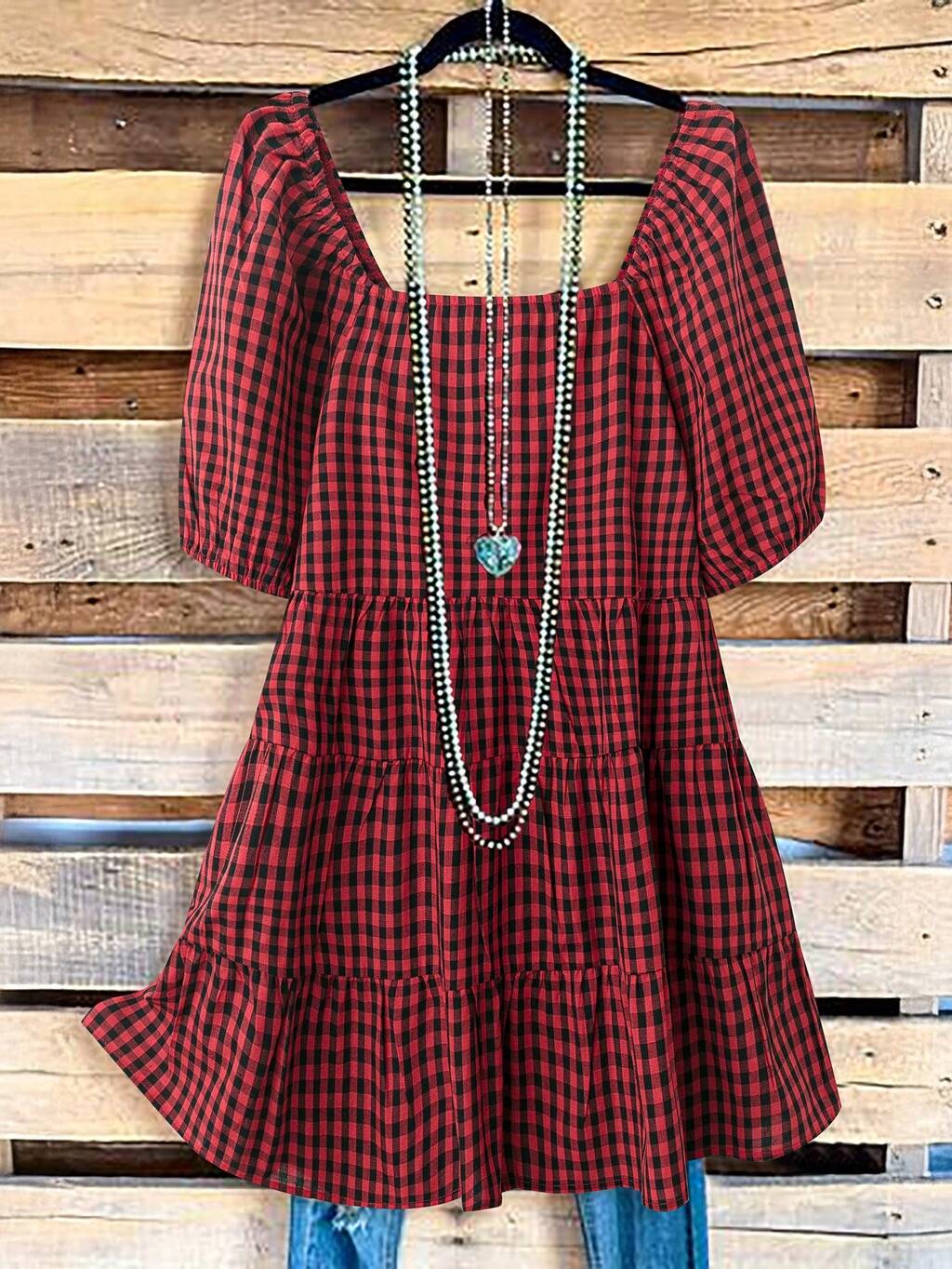 Plus Size Women Summer Country Casual Red Plaid Ruffled Loose Casual Short Sleeve Square Collar Babydoll Blouse, Women Blouse Summer, Summer For Women, Vacation Woman, Casual Everyday Wear