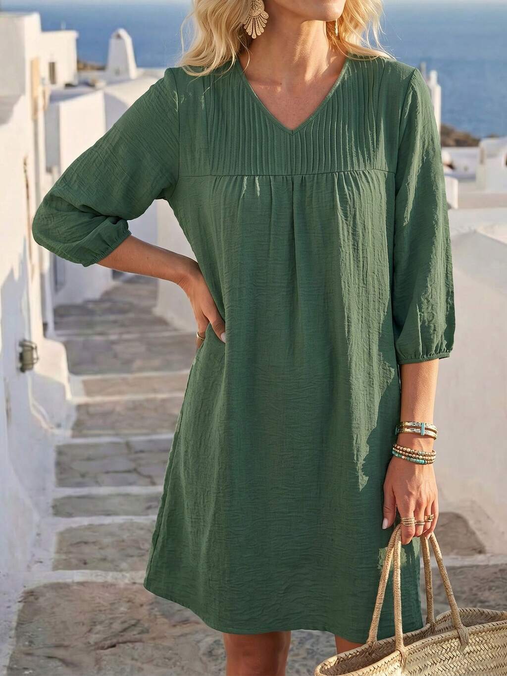 Damen einfarbiges V-Ausschnitt plissiertes lässiges minimalistisches Urlaubssommer Kleid