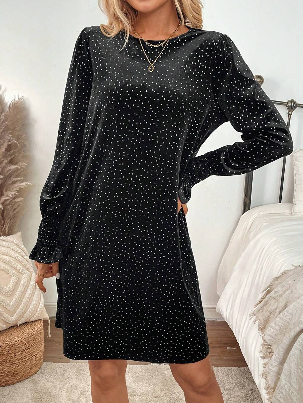 Damen Samt Kleid mit Polka Punkt Muster, Langarm, kurzes, elegantes Design