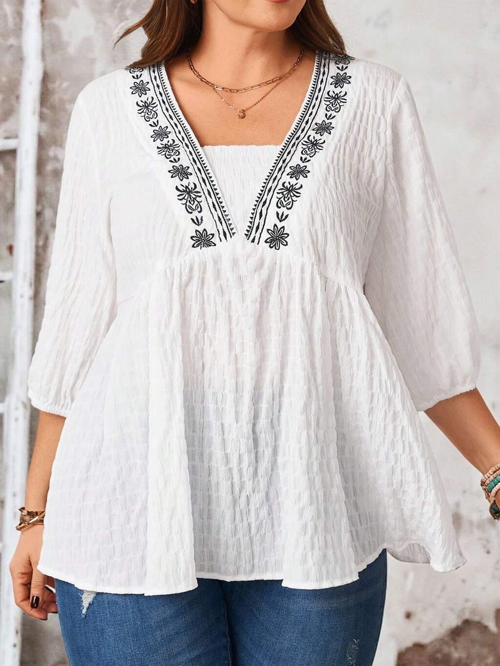 Blusa blanca casual y versátil para uso diario de mujer talla grande, con bordado floral y fruncido, ideal para verano, vacaciones, primavera, salidas, 2026 nueva, simple y de moda para uso diario, blusa bohemia casual de vacaciones, adecuada para verano, vacaciones, trayecto, uso diario