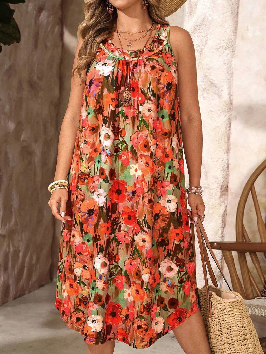 Vestido de verano de talla grande con cuello redondo y sin mangas con estampado floral