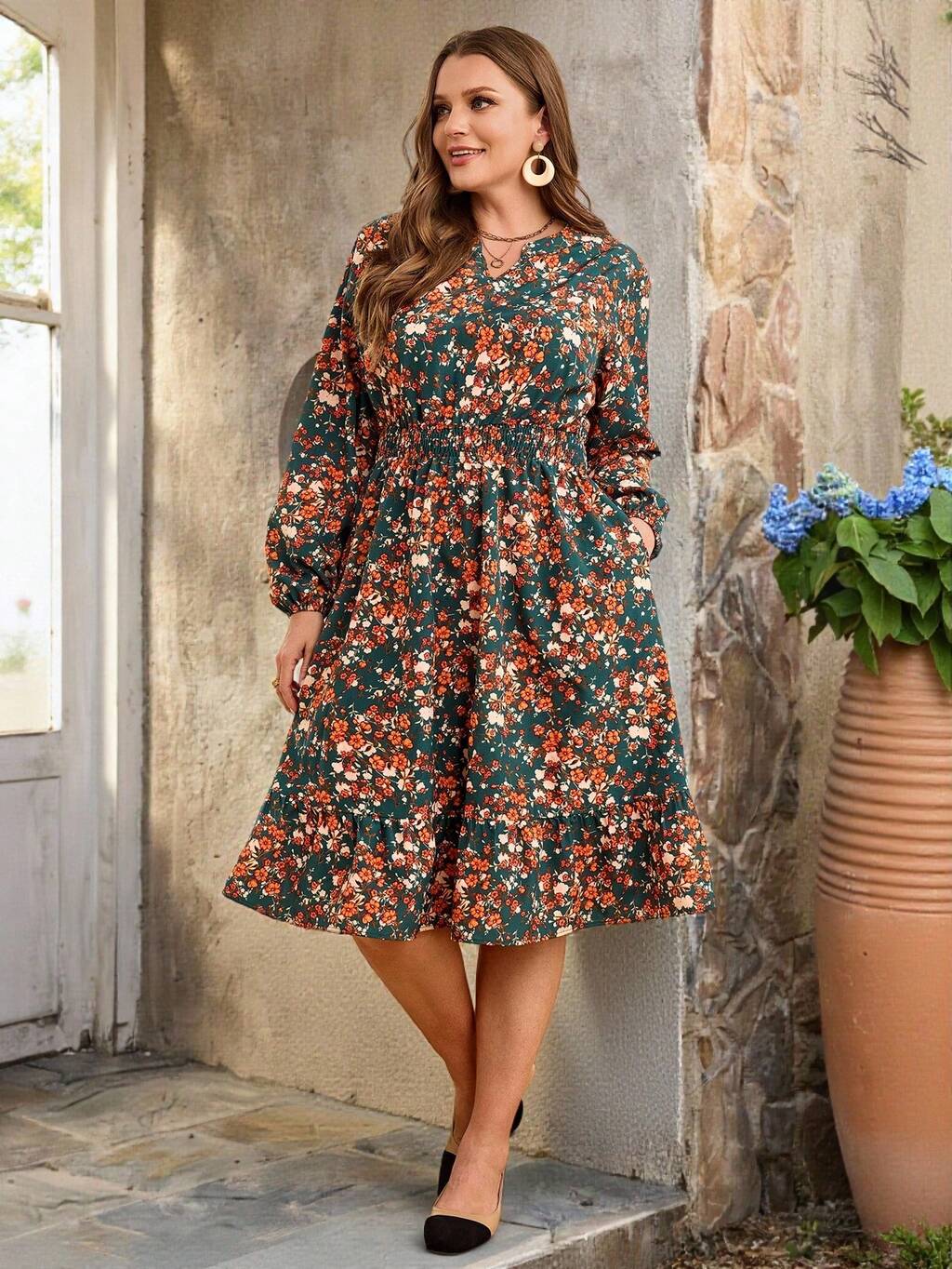 Vestido con estampado floral y cuello dividido para tallas grandes