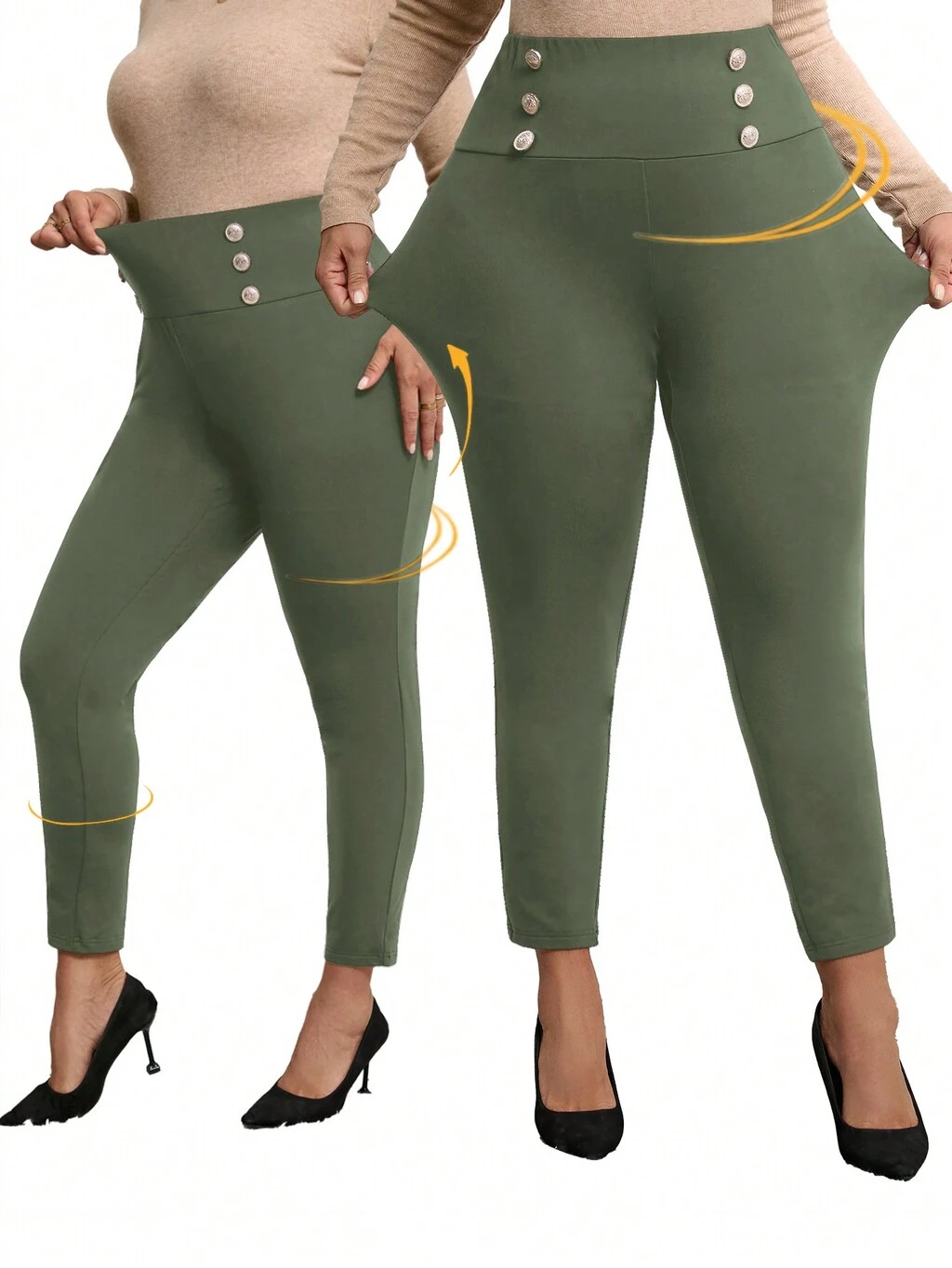 Pantalones elásticos entallados de doble botonadura de talla grande, Leggings suaves