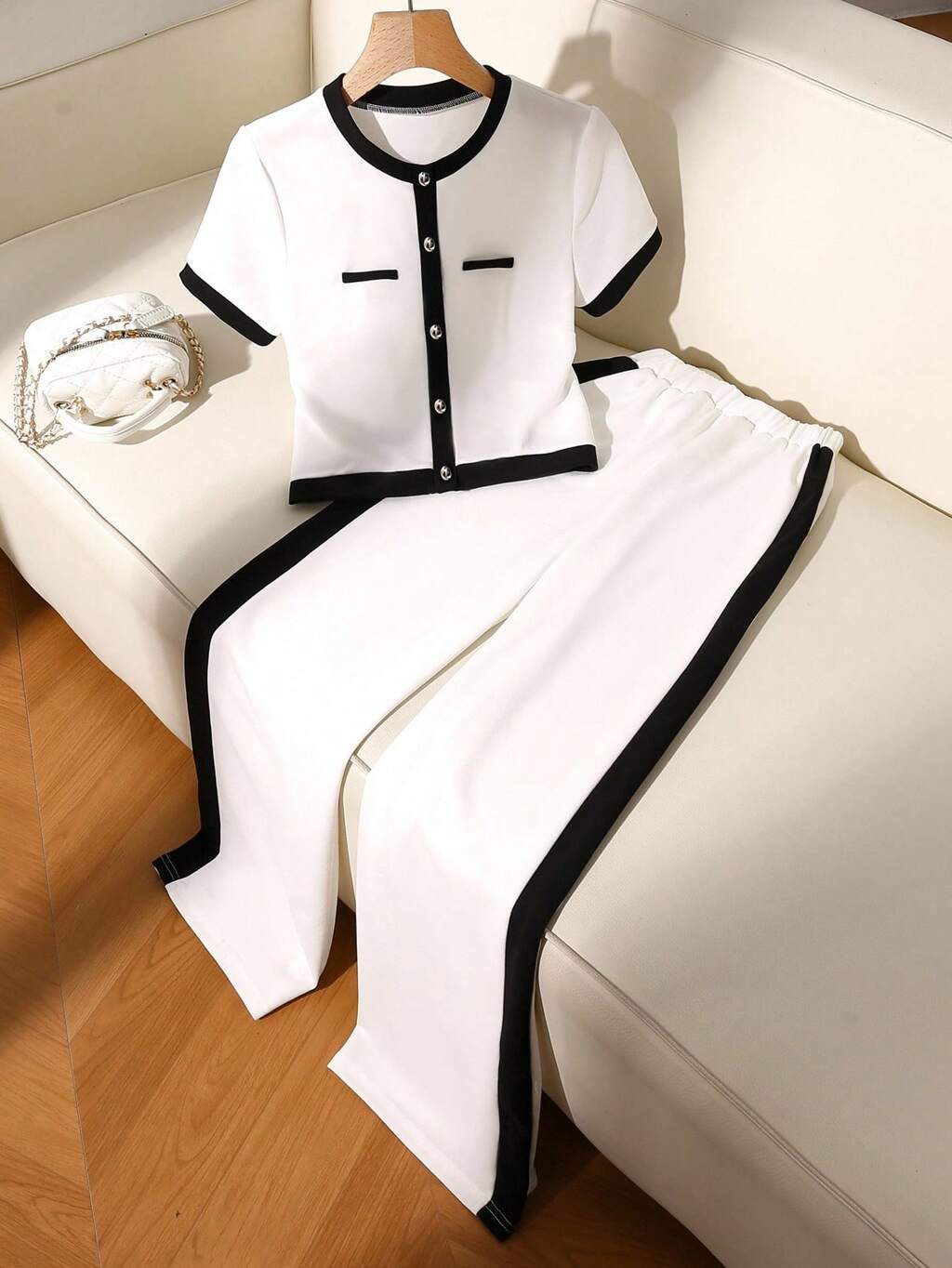 2 piezas Conjunto elegante para mujer: Top de manga corta con botones delanteros y ribete de contraste, y pantalones largos. Conjunto de 2 piezas a juego para mujer. Conjunto de ropa para mujer. Conjunto de ropa para maestras. Ropa de vuelta al colegio para mujer. Conjunto de aeropuerto para mujer. Conjunto de salida para mujer. Conjunto de oficina para mujer