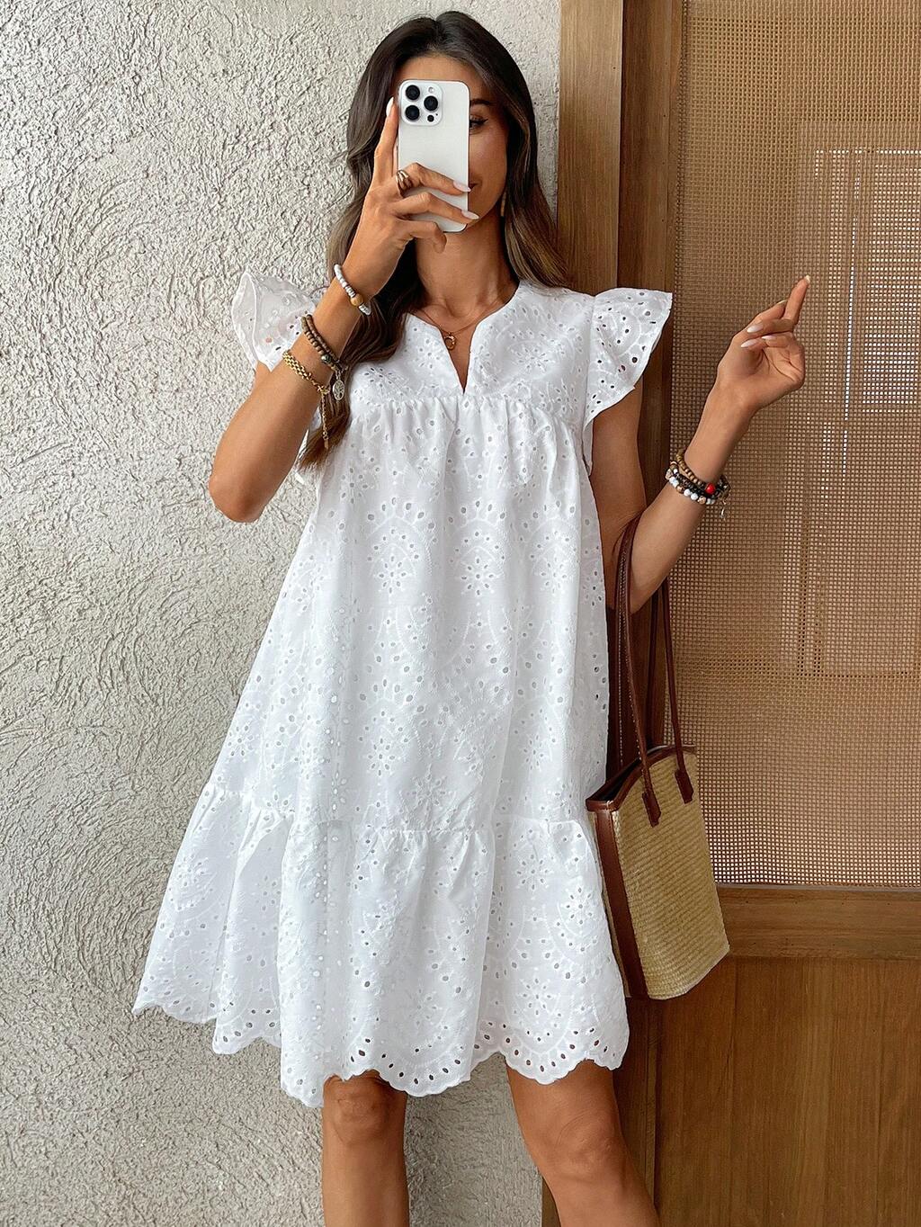 Vestido mini casual de vacaciones para mujer de unicolor con bordado hueco