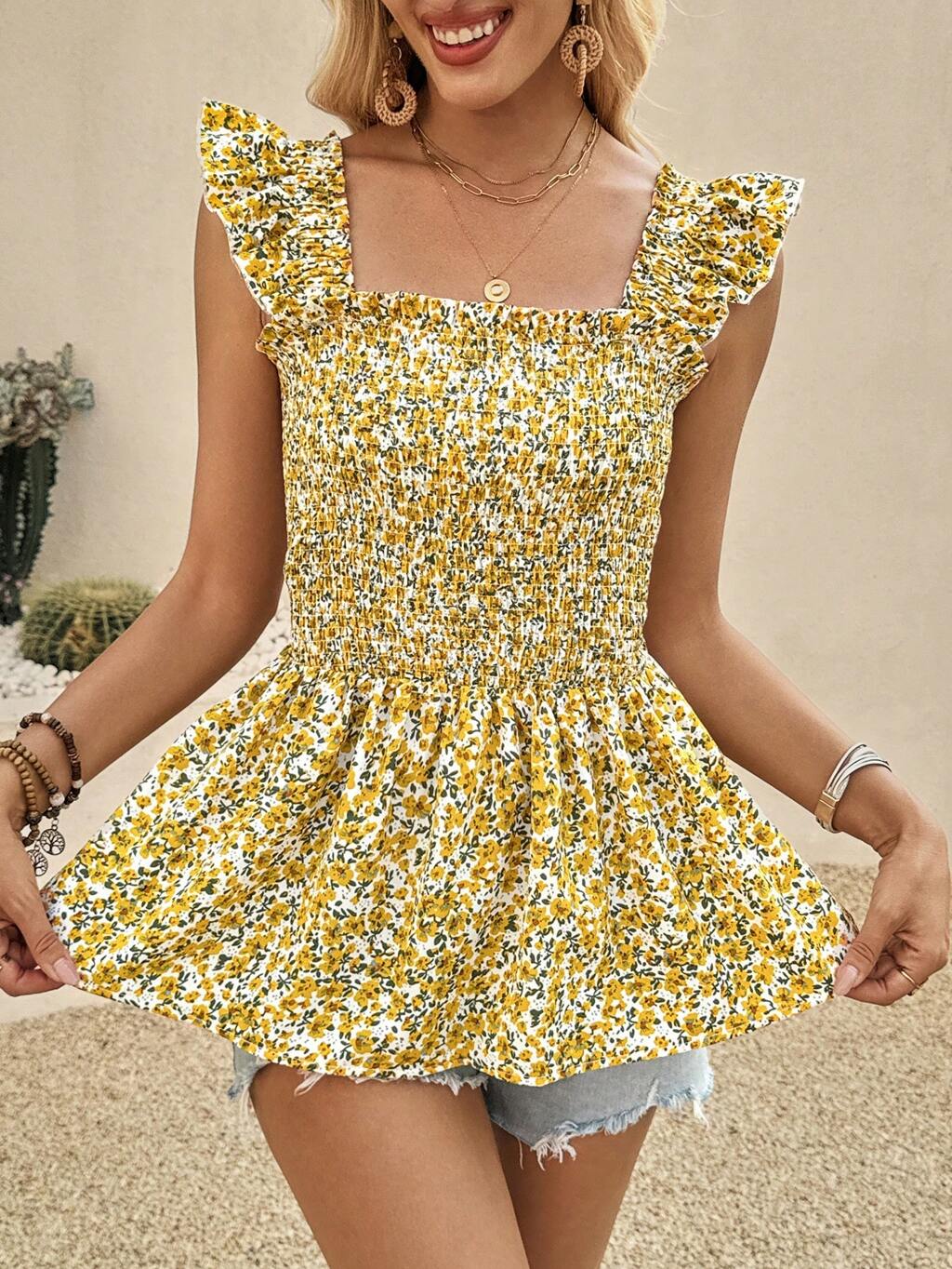 Blusa de verano para mujer con estampado floral, cuello cuadrado, mangas de volantes tipo peplum