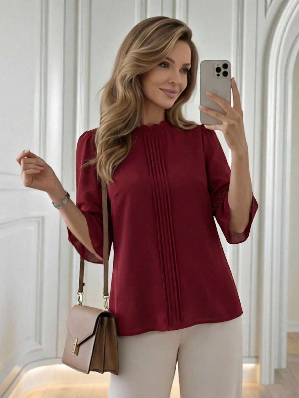 Esta elegante blusa de mujer presenta un rico color borgoña con detalles de estampado de leopardo, capturando perfectamente el espíritu festivo del Año Nuevo mientras irradia un aire de moda e individualidad. Los adornos de estampado de leopardo en el cuello y los puños añaden un toque de sofisticación discreta. El diseño de manga corta y holgado y el material de satén crean una sensación de lujo, mientras que el corte cómodo favorece a diversos tipos de Body. Adecuada para primavera y otoño, se puede combinar con pantalones negros para un aspecto pulido o superponerla con una chaqueta para mayor profundidad. Perfecta tanto para los trayectos al trabajo como para reuniones informales, esta blusa burdeos ofrece un aspecto sofisticado en el trabajo, mientras que los detalles de estampado de leopardo añaden un toque de estilo, convirtiéndola en una pieza versátil para tu guardarropa de Año Nuevo que combina elegancia y personalidad.