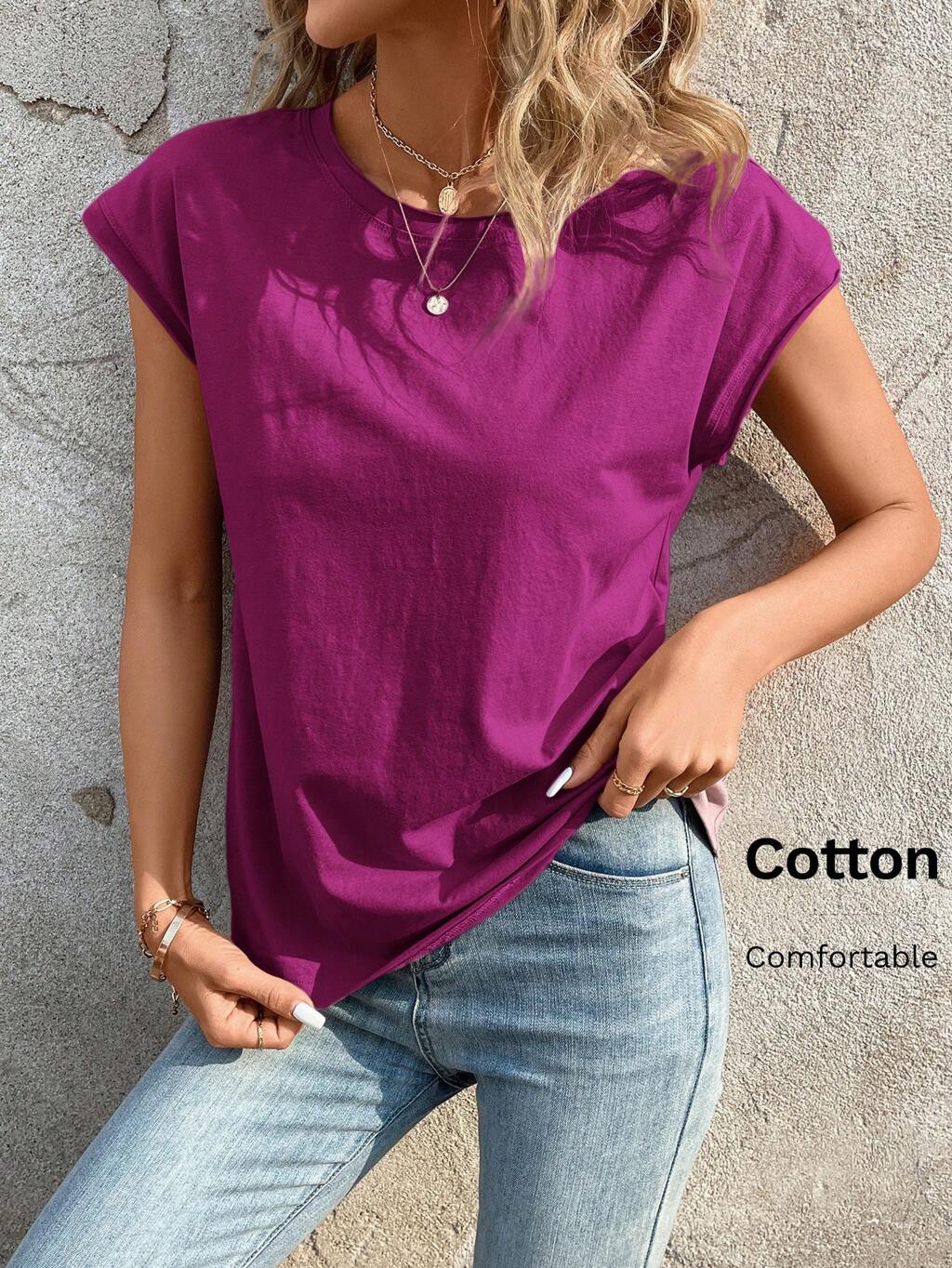 Camiseta casual holgada de mujer de cuello redondo y unicolor