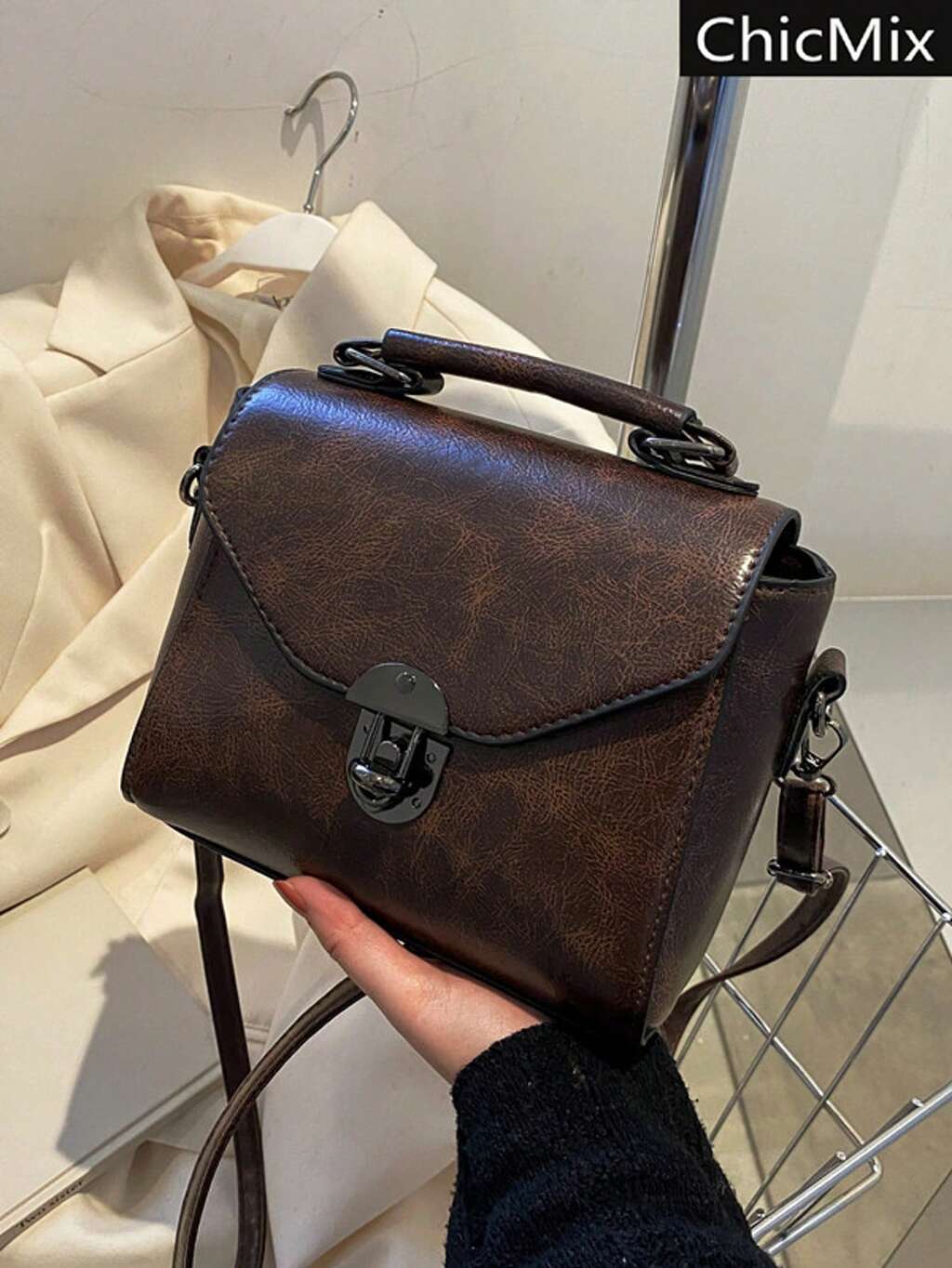 1 pieza Bolso de mano con solapa de moda retro en bloque de color, cierre de cremallera, correa cosida, correa para el hombro, adecuado para uso diario, ir al trabajo, color café