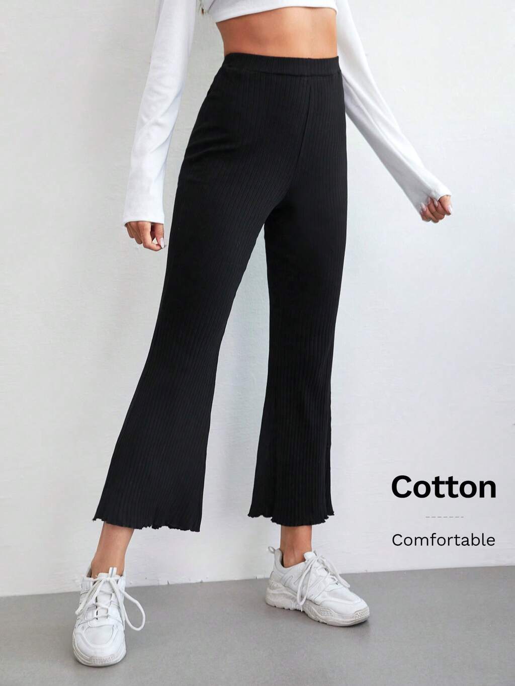 Pantalones de cintura alta con bolsillos en diagonal, dobladillo con abertura y color negro sólido con elástico para mujer. Pantalones formales para uso casual de negocios, otoño/invierno
