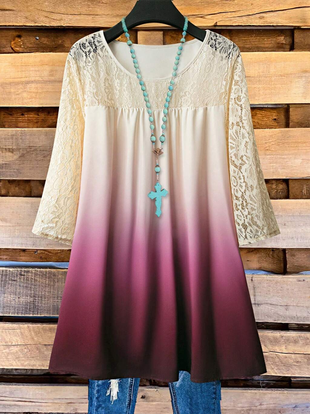 Blouse tunique ample à manches courtes, col rond, avec dentelle bicolore dégradée, pour femmes grandes tailles