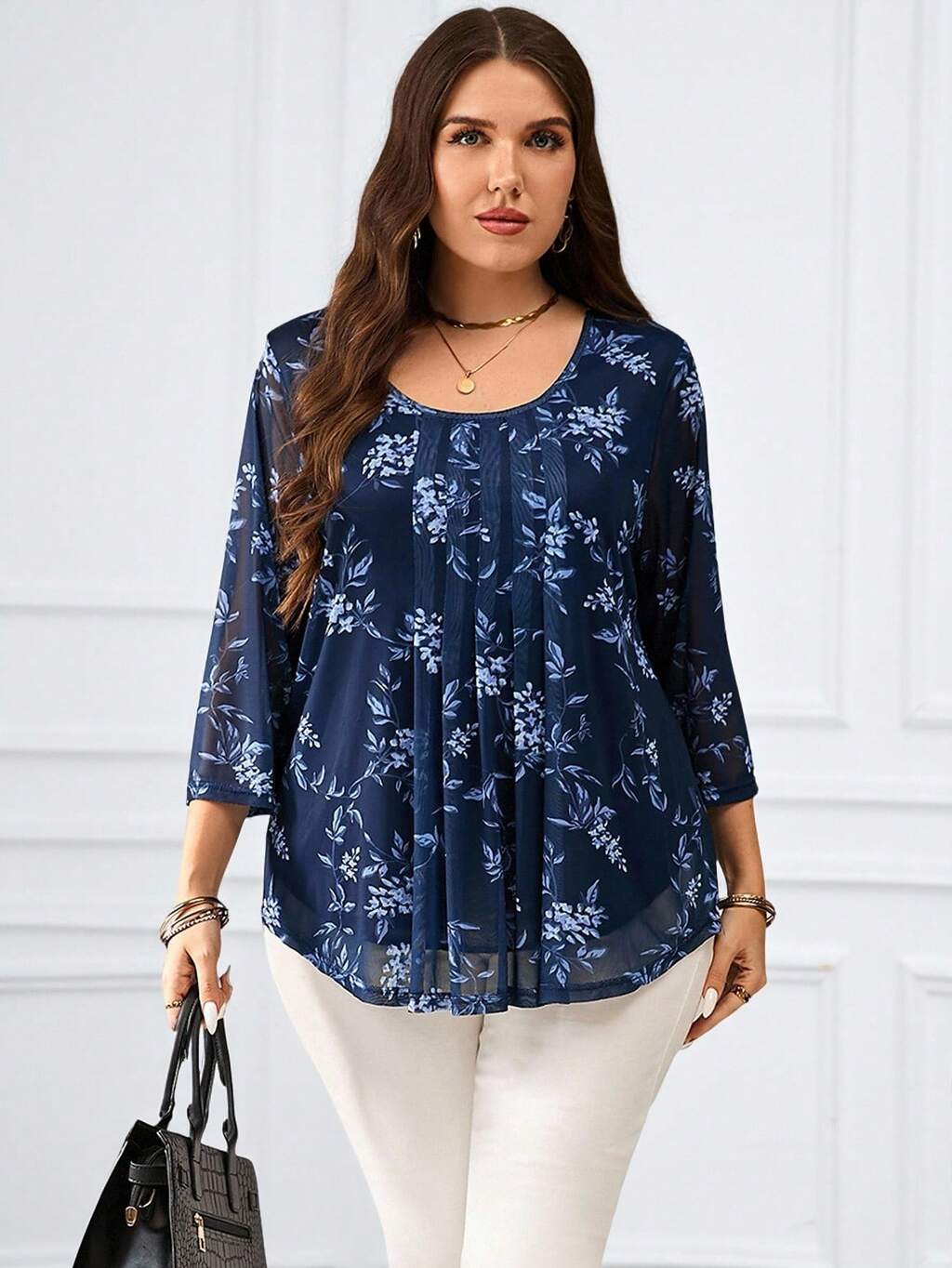 Blouse à imprimé floral bleu, manches 3/4, grande taille, pour femmes, idéale pour le début du printemps et l'été, pour les vacances
