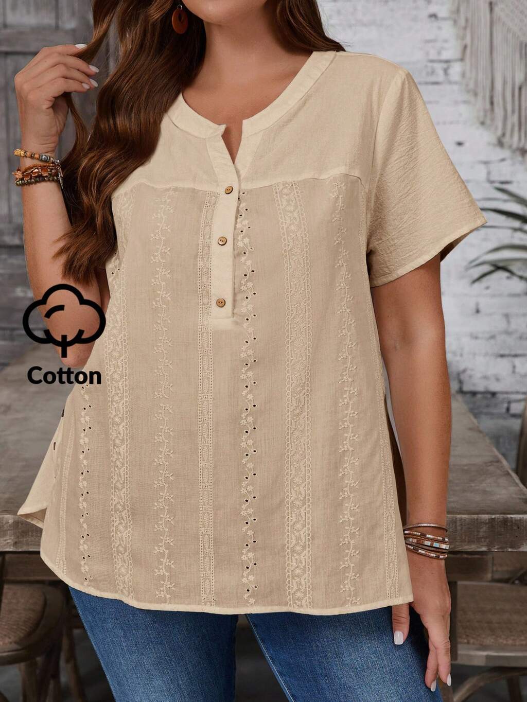 Chemise d'été polyvalente et décontractée à encolure ronde, broderie ajourée, pour femmes grandes tailles, pour un port quotidien