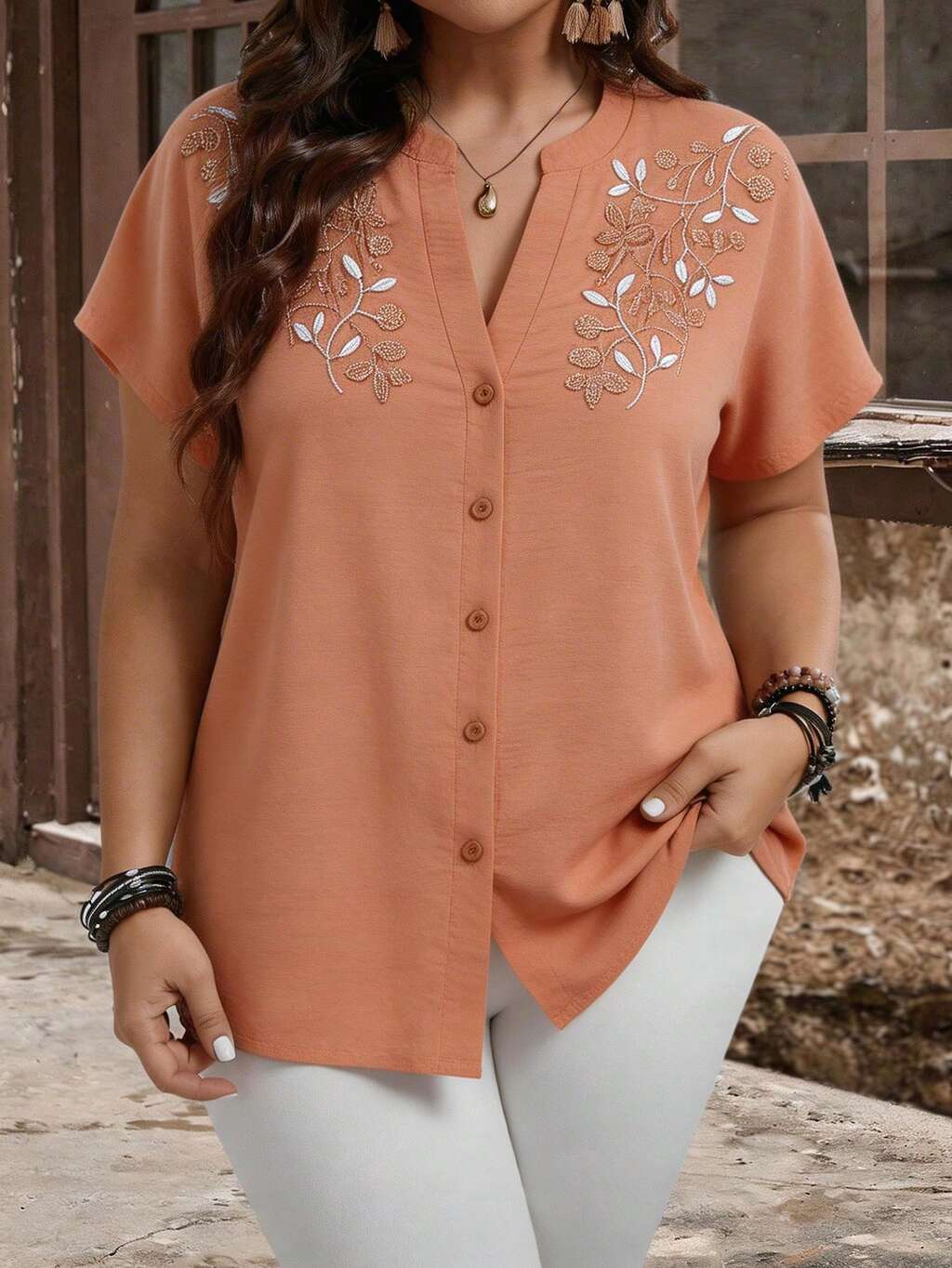Chemise décontractée à manches courtes chauve-souris, col en V, avec broderie végétale, pour femmes grandes tailles