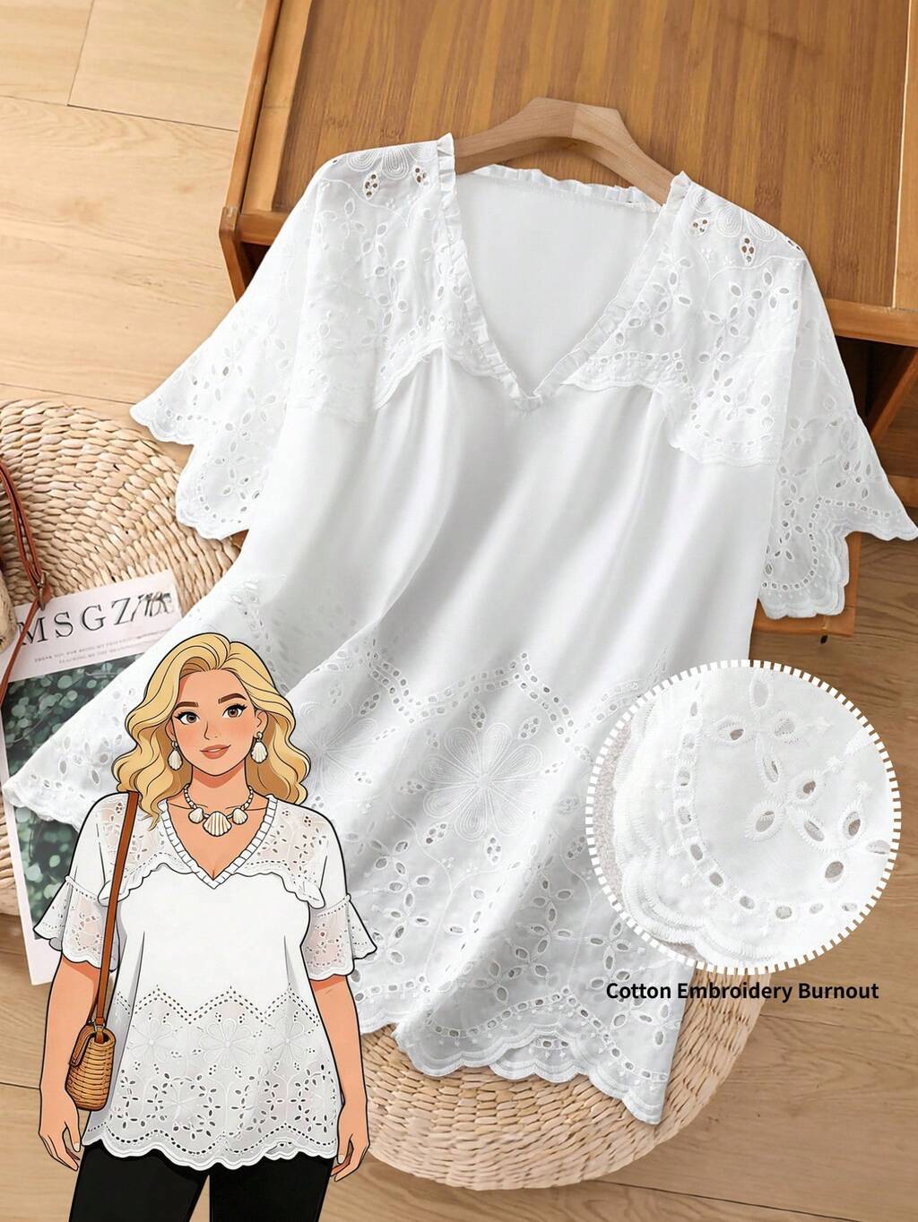 Chemise d'été décontractée grande taille de couleur unie avec broderie et découpes