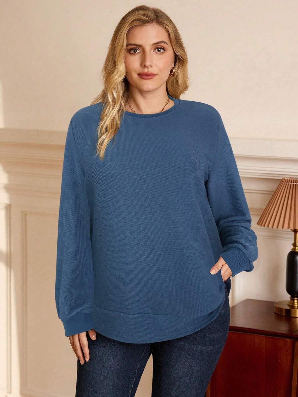 Sweat-shirt décontracté à manches longues, col rond, côtelé, couleur unie, grande taille pour femmes