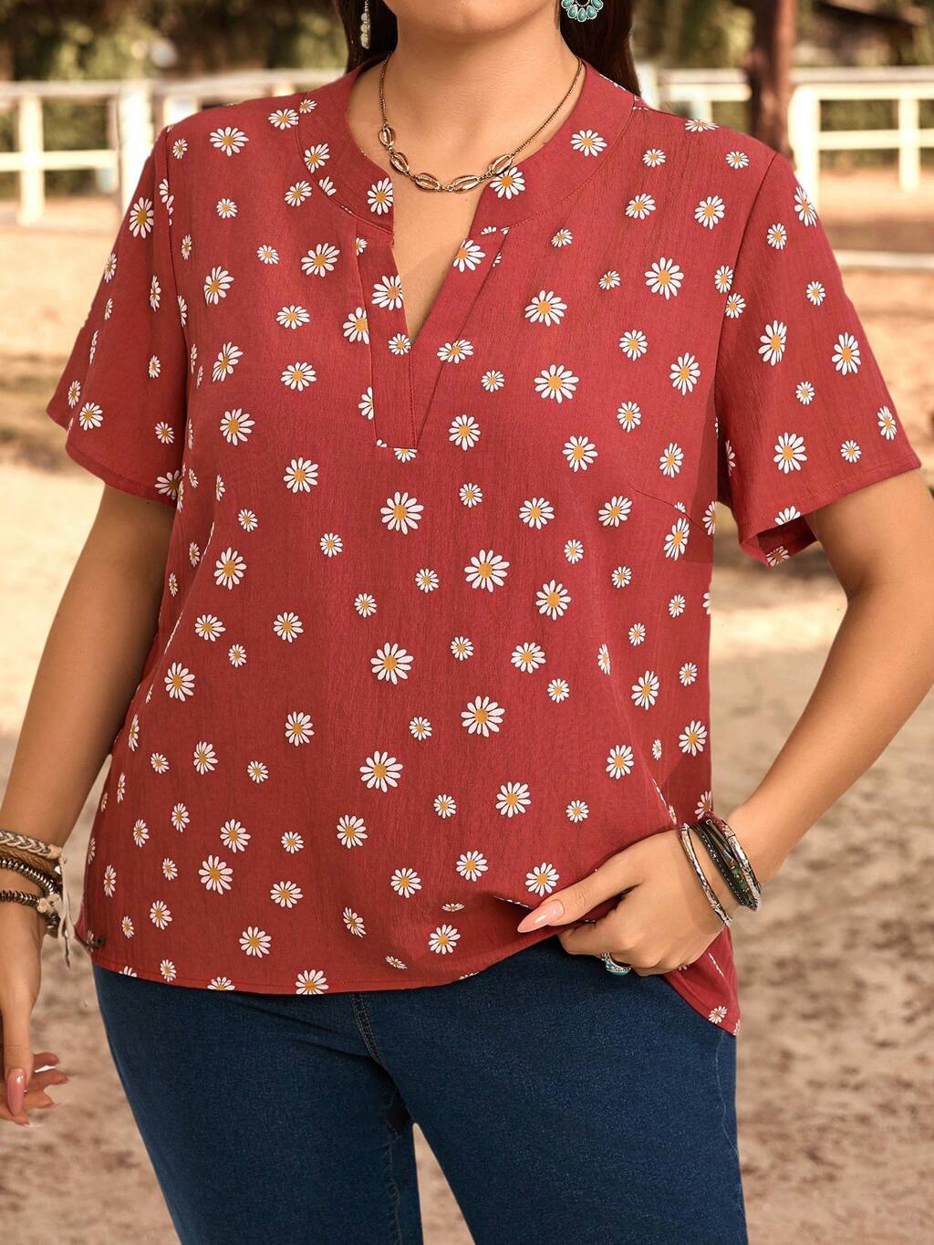 Blouse décontractée à col cranté avec imprimé floral marguerite, style campagne, pour femmes en grande taille, pour le printemps et l'été, pour le style occidental