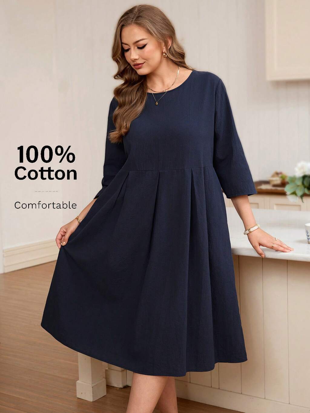 Robe bleu marine grande taille avec poches, silhouette ajustée, manches longues, élégante, en coton confortable
