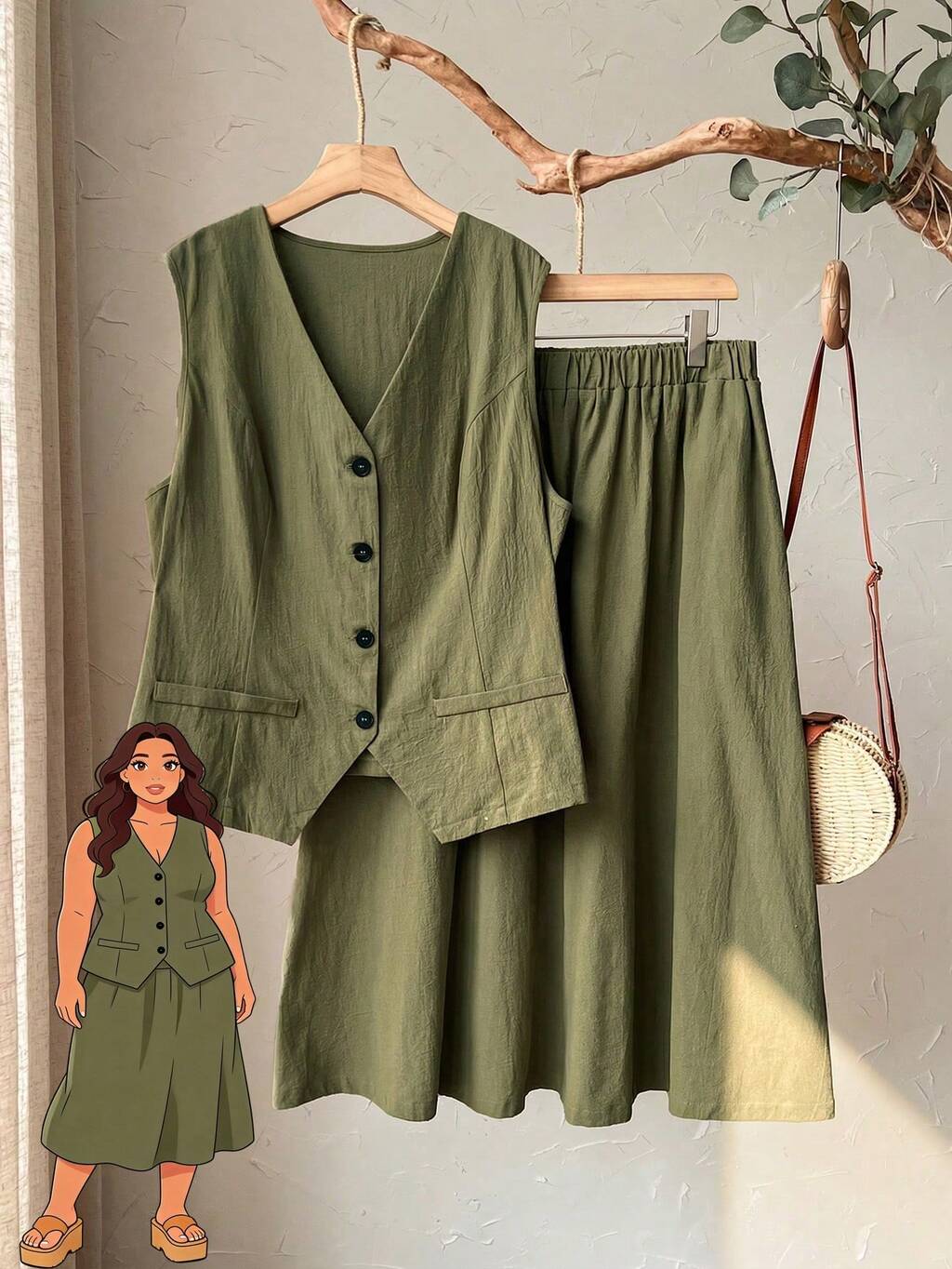 Ensemble 2 pièces grande taille pour femmes, chemise à manches courtes plissée et pantalon vert unicolore, style décontracté pour vacances, printemps