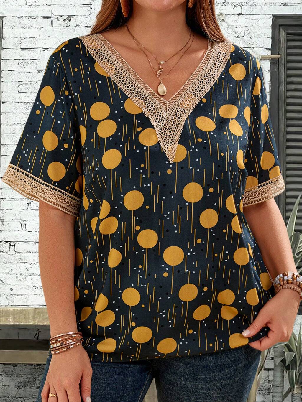 Chemise décontractée à manches retroussées avec imprimé géométrique pour femmes, printemps et été, thé, jaune beurre, automne, été, vacances, sortie