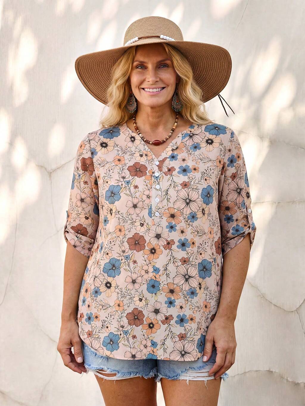 Blouse imprimée à manches 3/4 pour femmes grandes tailles, début du printemps
