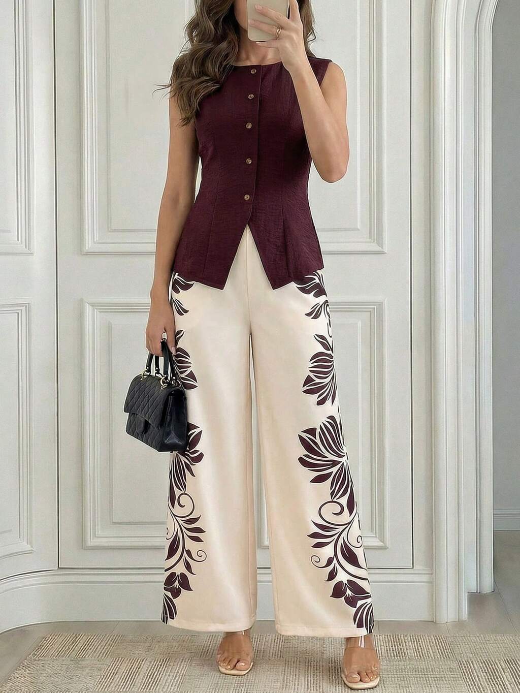 Ensemble 2 pièces décontracté pour femmes, Top unicolore à simple boutonnage et pantalon large