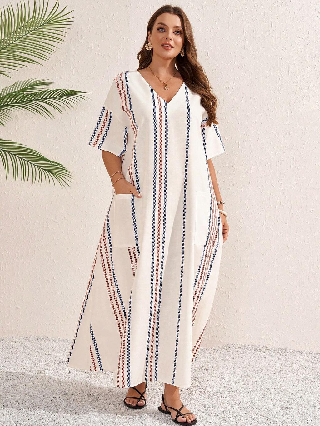 Robe d'été décontractée à rayures, col V ample et manches courtes avec poches, pour femmes grandes tailles
