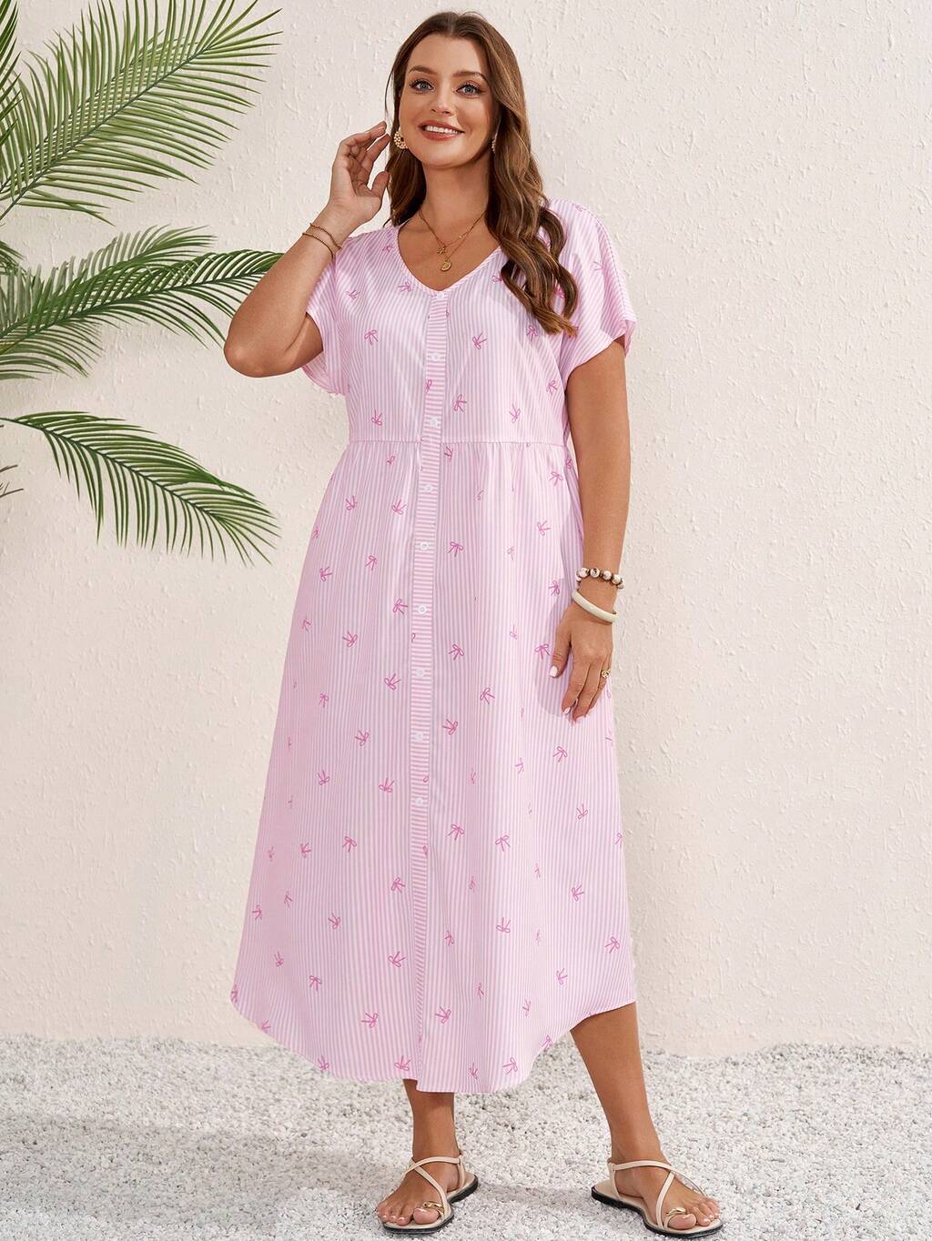 Robe imprimée florale à col V et manches courtes pour femmes grandes tailles, convient pour les vacances d'été