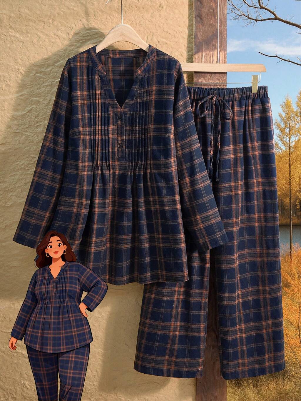Ensemble 2 pièces grande taille pour femmes, chemise à manches longues et pantalon décontracté à carreaux avec poches, automne/hiver