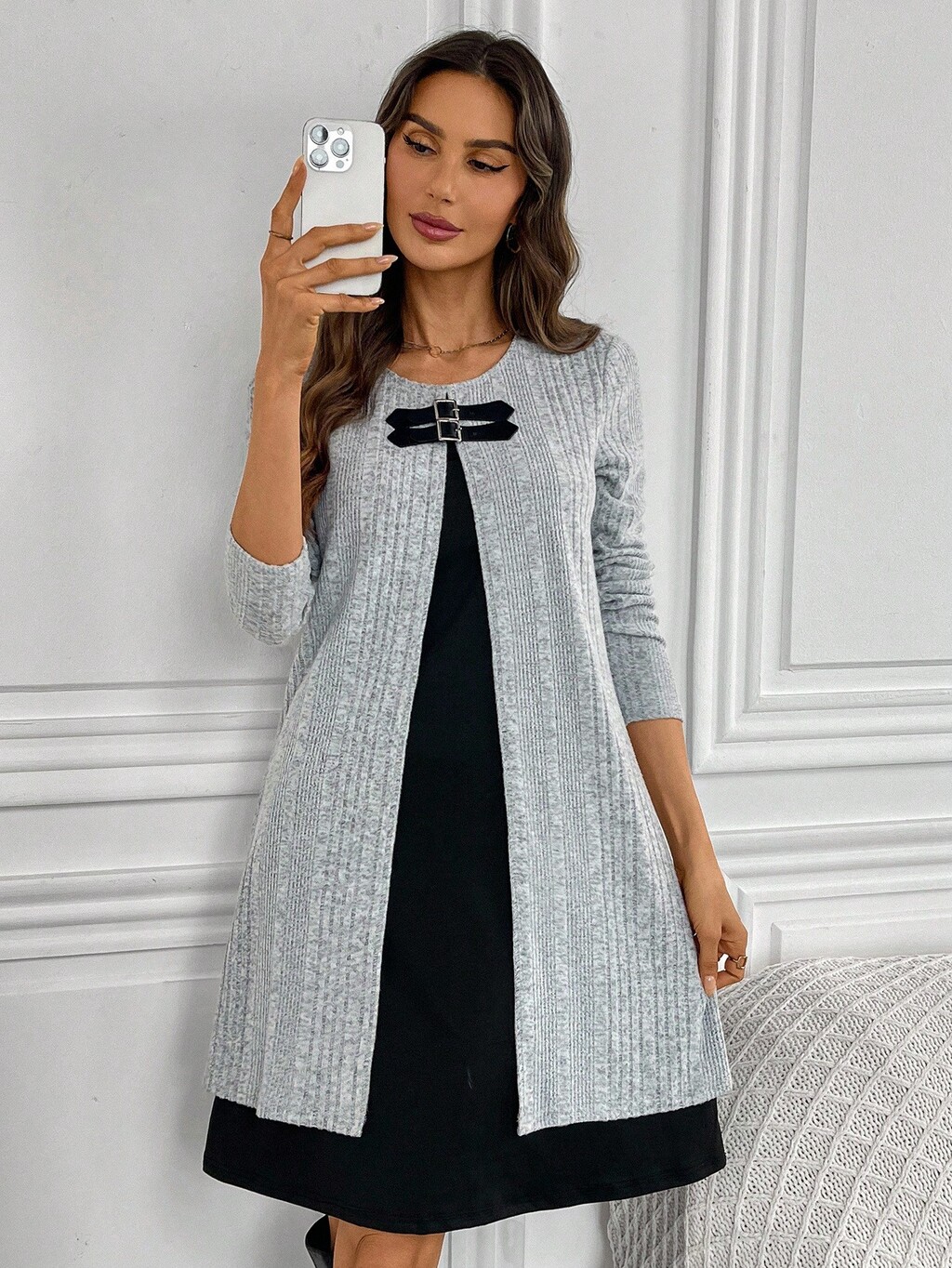 Robe courte décontractée ample à manches longues, col rond, avec boutons et côtes contrastées