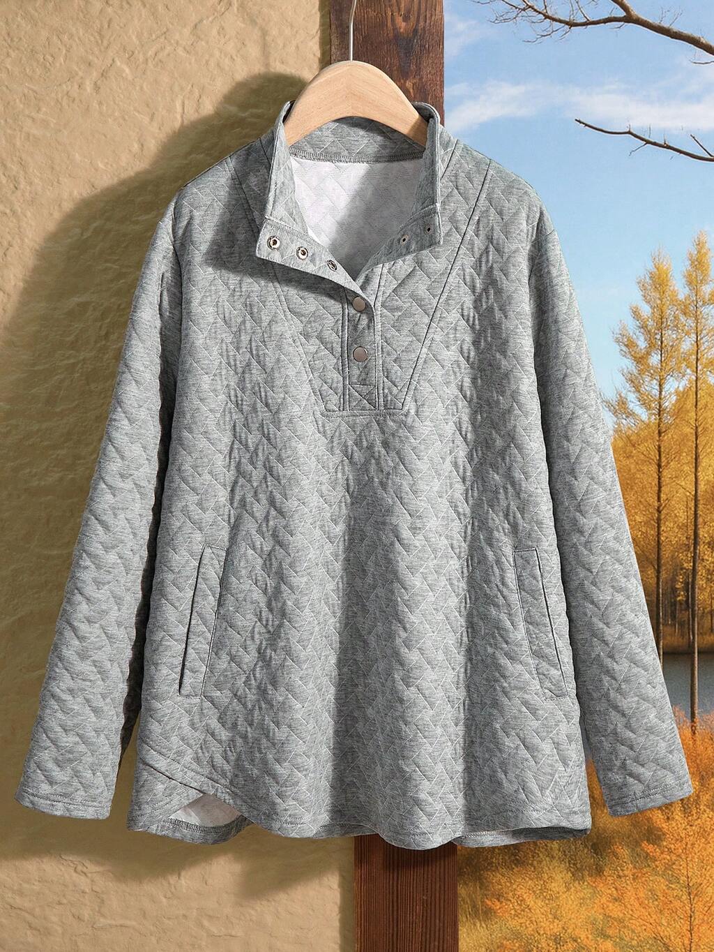 Sweat-shirt-shirt gris à col montant, manches longues, couleur unie, avec poches, pour femmes grandes tailles. Décontracté pour l'automne/hiver, sortie, nouveau modèle 2025, simple et pour un port quotidien. Sweat-shirt-shirt, hauts gris avec design boutonné, Noël, Nouvel An