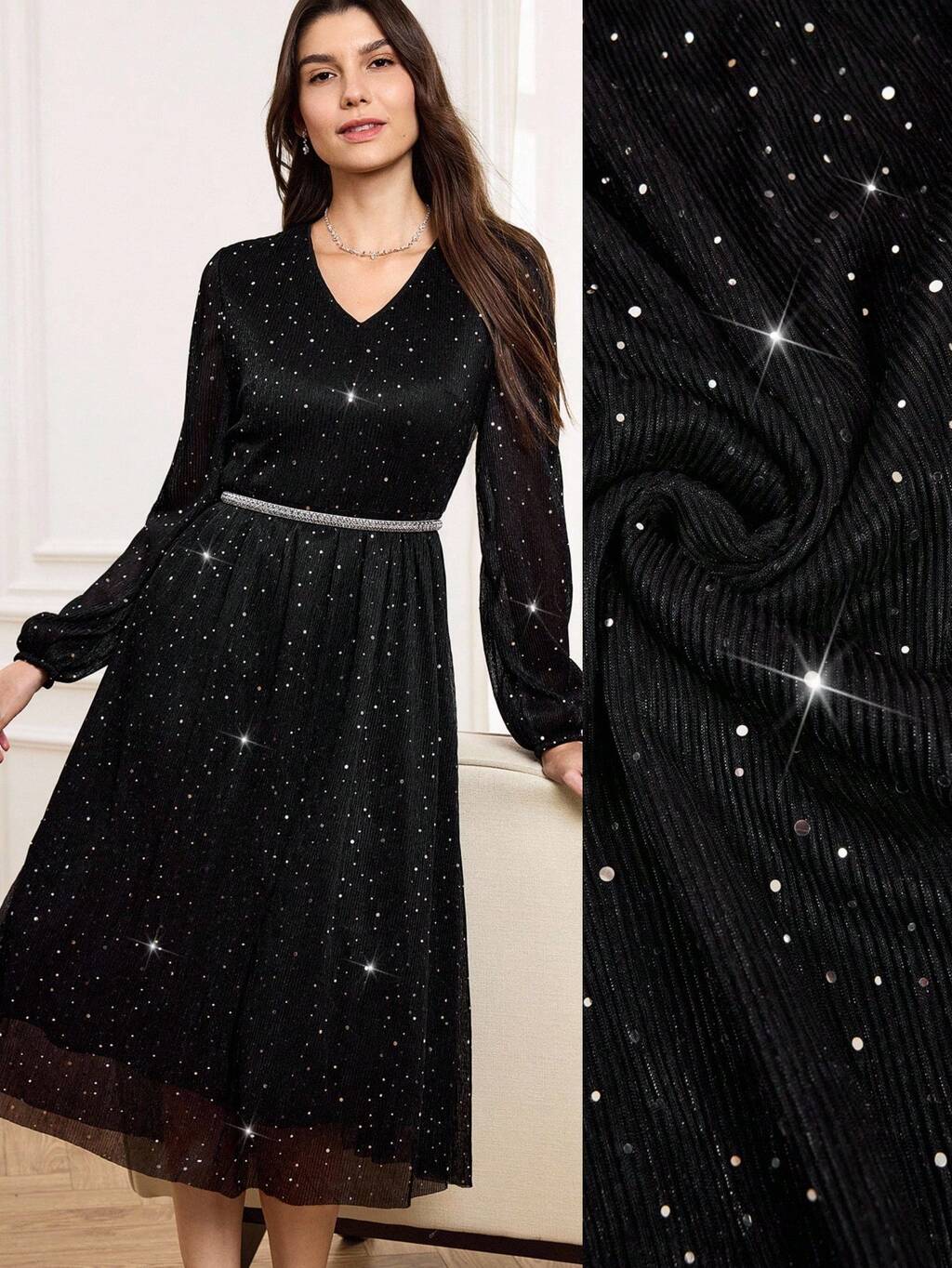Robe élégante pour femme, robe mi-longue noire évasée en maille pailletée à manches bouffantes, col V, élégante, convient pour les sorties élégantes, les fêtes et les réunions, automne/hiver