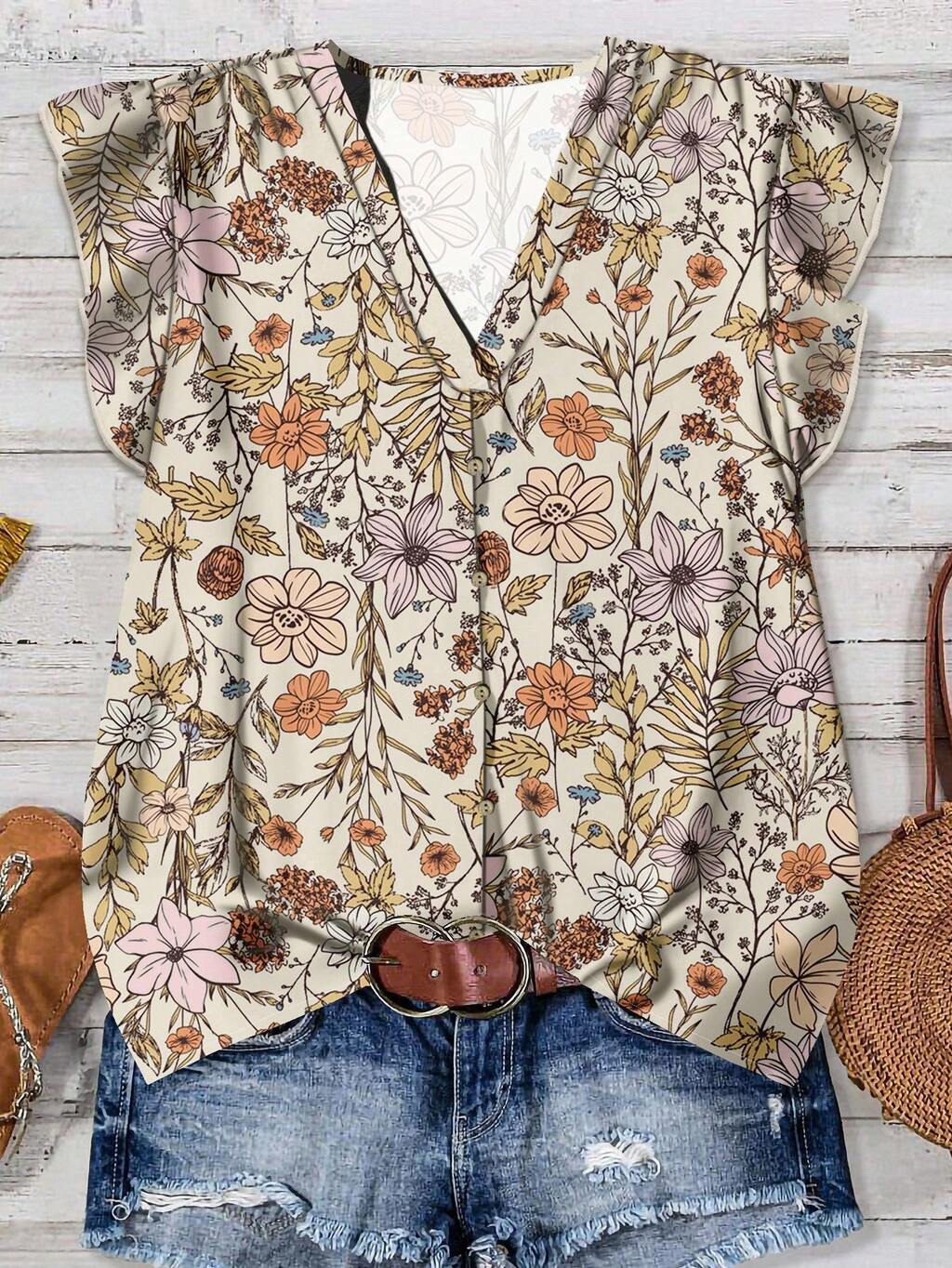 Blouse décontractée à col V et manches courtes avec imprimé floral, convient pour les blouses bohèmes d'été. Blouses florales pour femmes, chemises bohèmes pour femmes, blouses d'été pour femmes, hauts fleuris pour femmes