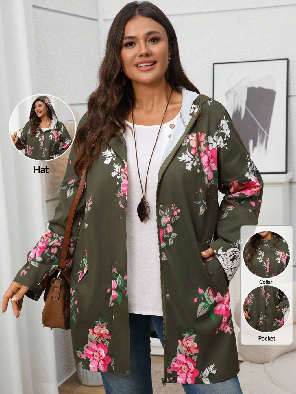Manteau trench à capuche ample et décontracté avec poches, imprimé floral, manches longues, pour femmes grandes tailles