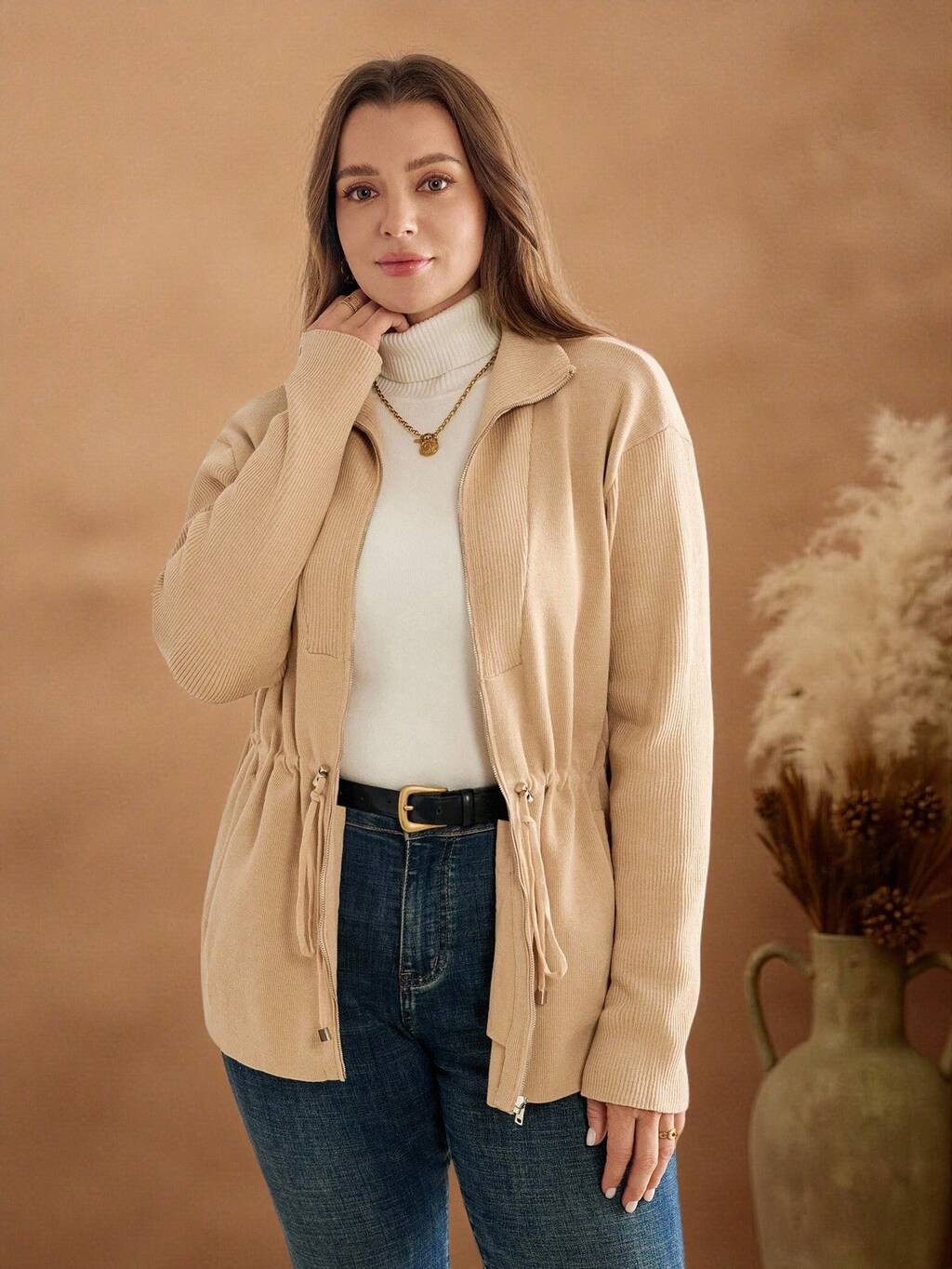 Cardigan en tricot décontracté pour femmes grandes tailles, couleur unie, manches longues, fermeture éclair avant, taille resserrée par cordon