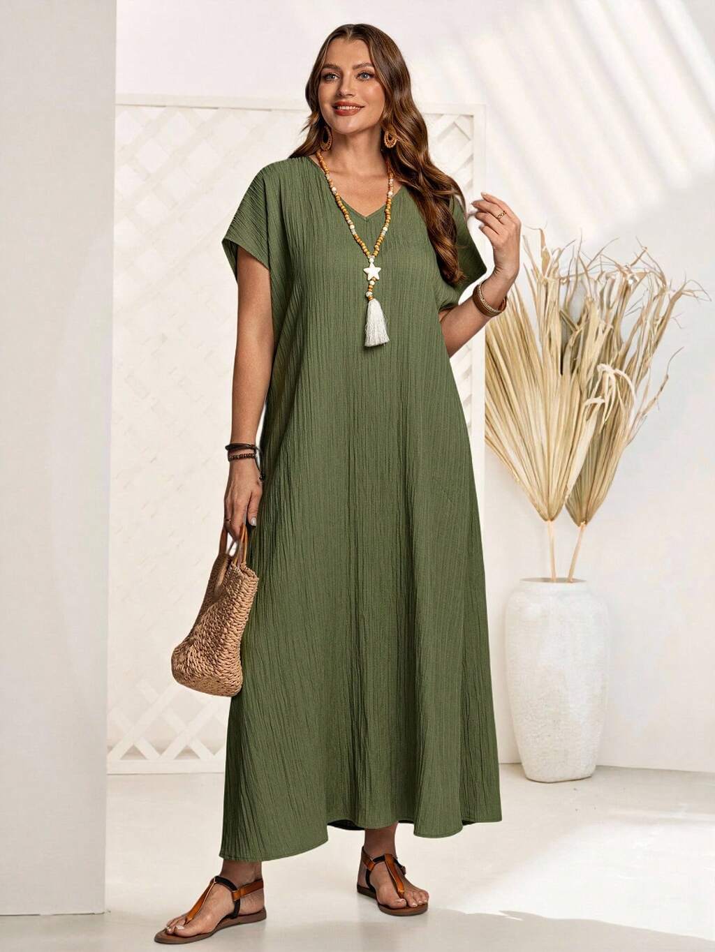 Robe décontractée ample à manches courtes chauve-souris col en V grande taille, vêtements d'été, tenues de vacances pour femme / vacances, vêtements bohèmes pour femmes