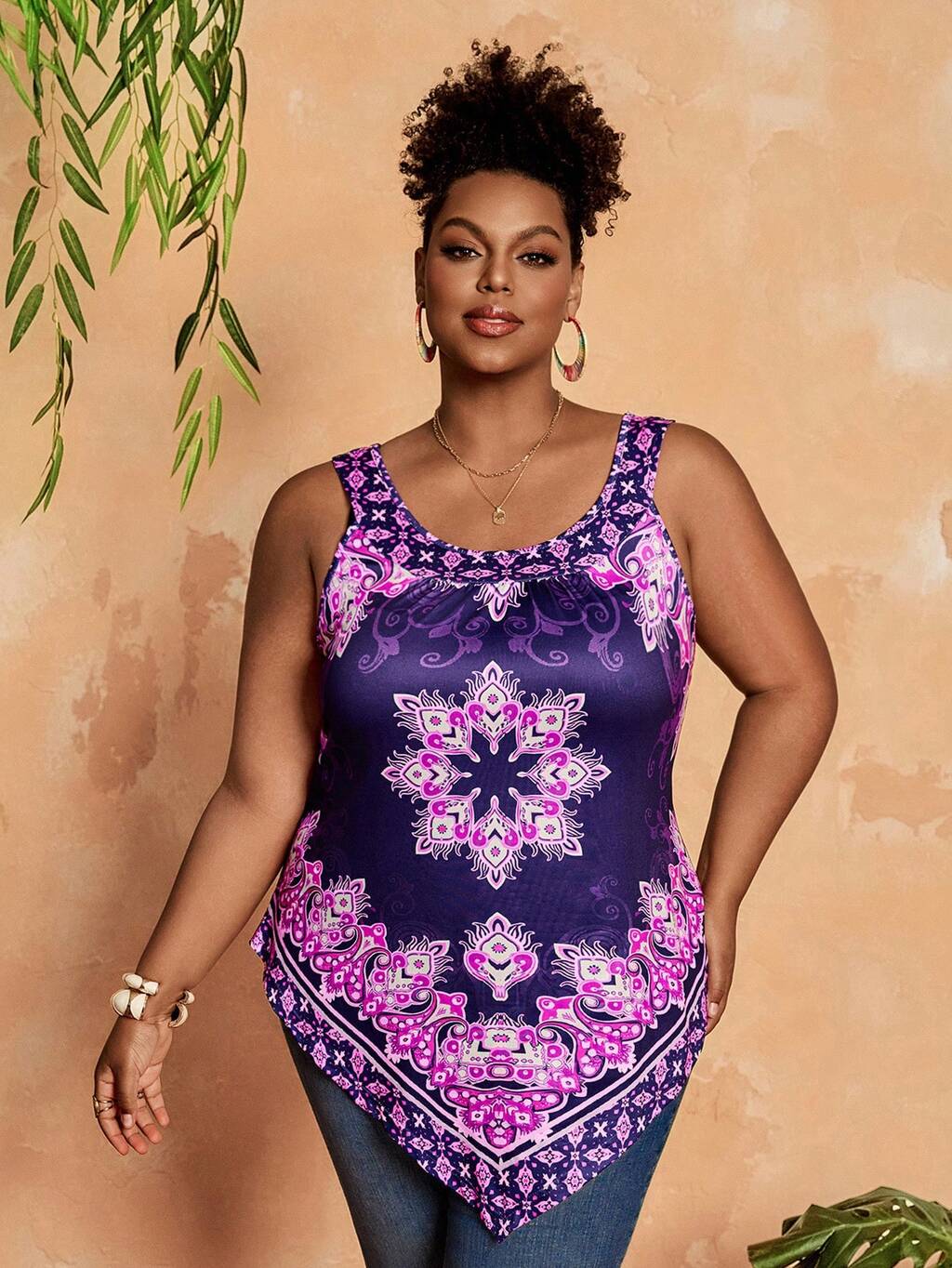Débardeur décontracté polyvalent à imprimé floral pour femmes grandes tailles. Hauts pour femmes grandes tailles. Vêtements d'été pour femmes grandes tailles. Hauts de mode pour femmes. Tenues d'été. Vêtements d'été. Robes de printemps. Tenues de printemps. Vêtements de printemps pour femmes. Tenues de vacances à la plage pour femmes. Robes de vacances. Tenues de festival bohème pour femmes. Tenues de plage pour femmes