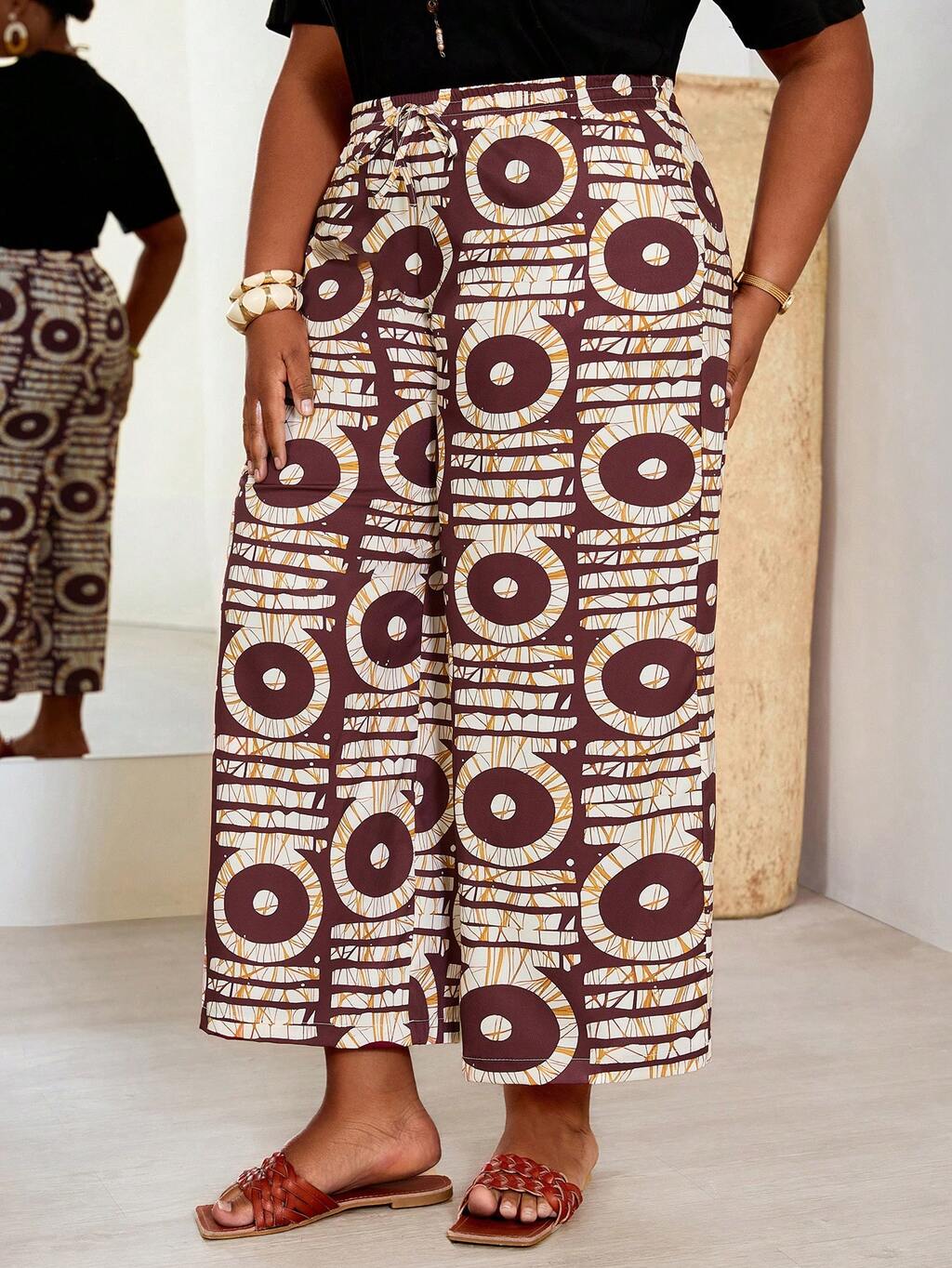 Pantalon ample à jambes larges avec motif géométrique, ceinture à nouer et poches pour femmes grandes tailles