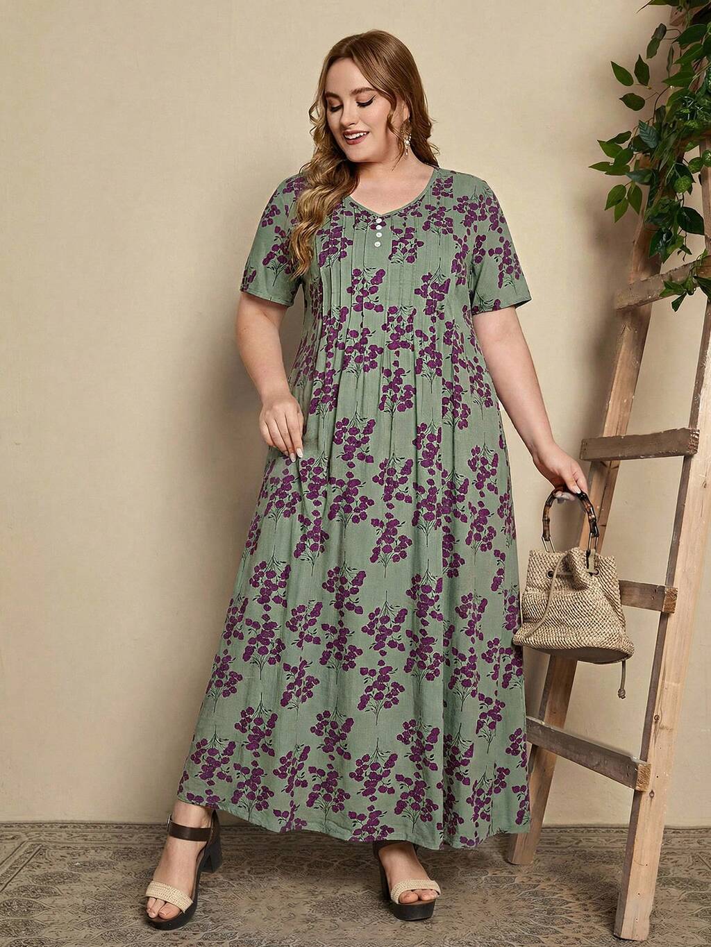 Robe d'été décontractée à col V et manches courtes avec imprimé végétal pour femmes grandes tailles. Tenues d'été pour vacances à la plage. Robe fleurie style bohème. Tenues d'été pour femmes en villégiature. Robes d'été longues pour femmes. Robes d'été décontractées pour femmes. Tenues de plage pour femmes. Tenues de vacances décontractées pour femmes. Tenue de concert country pour femme. Peplum